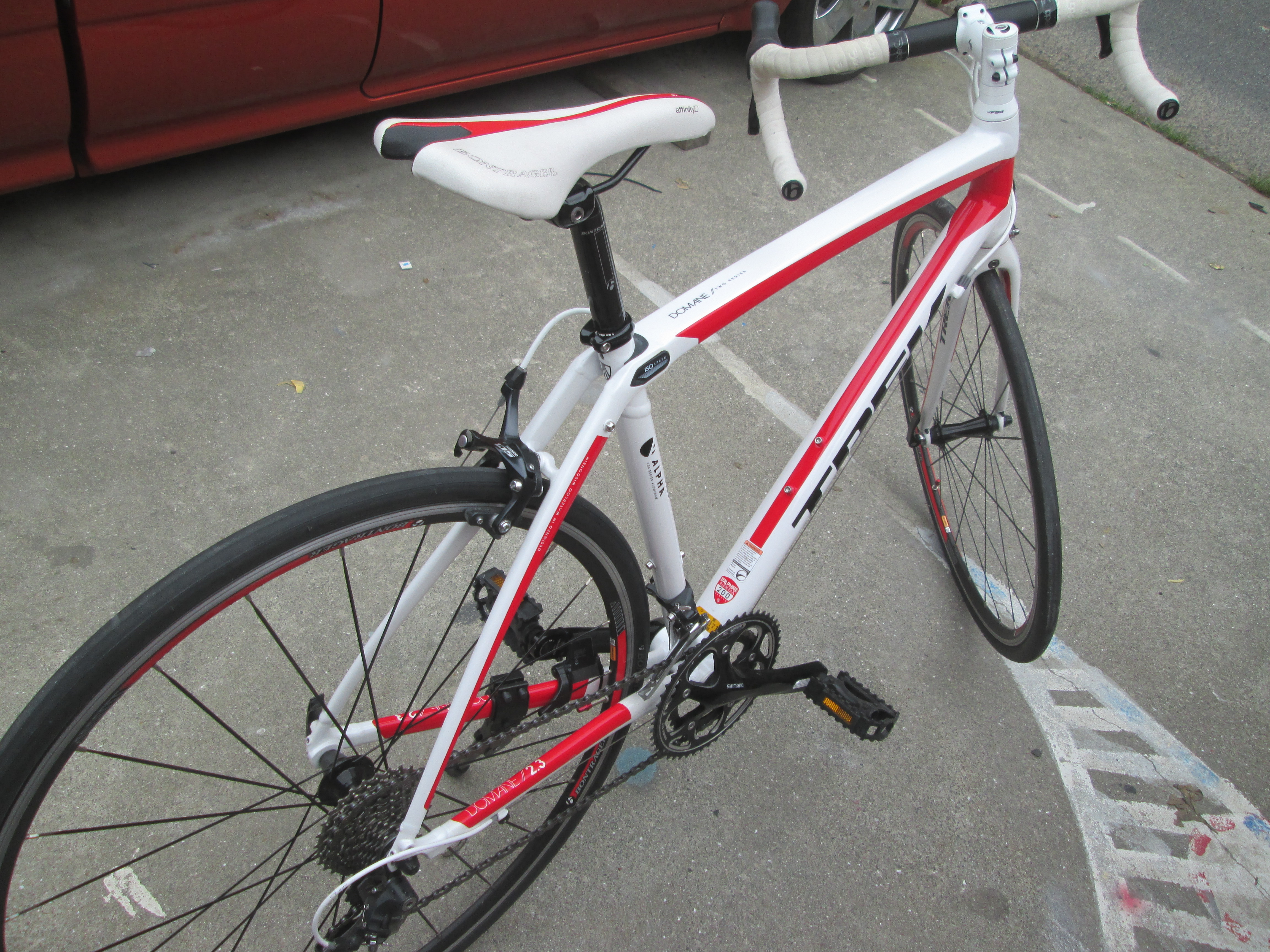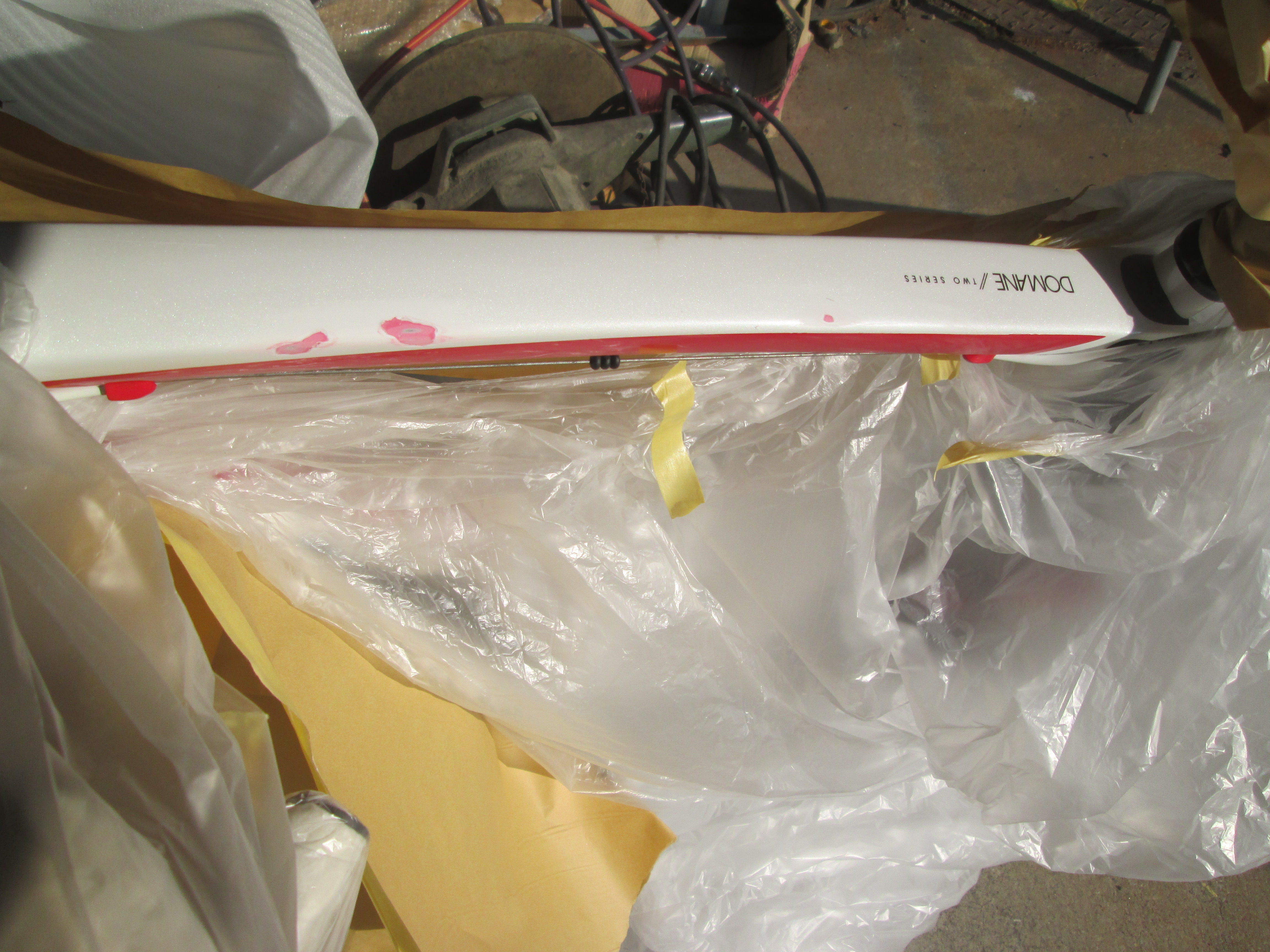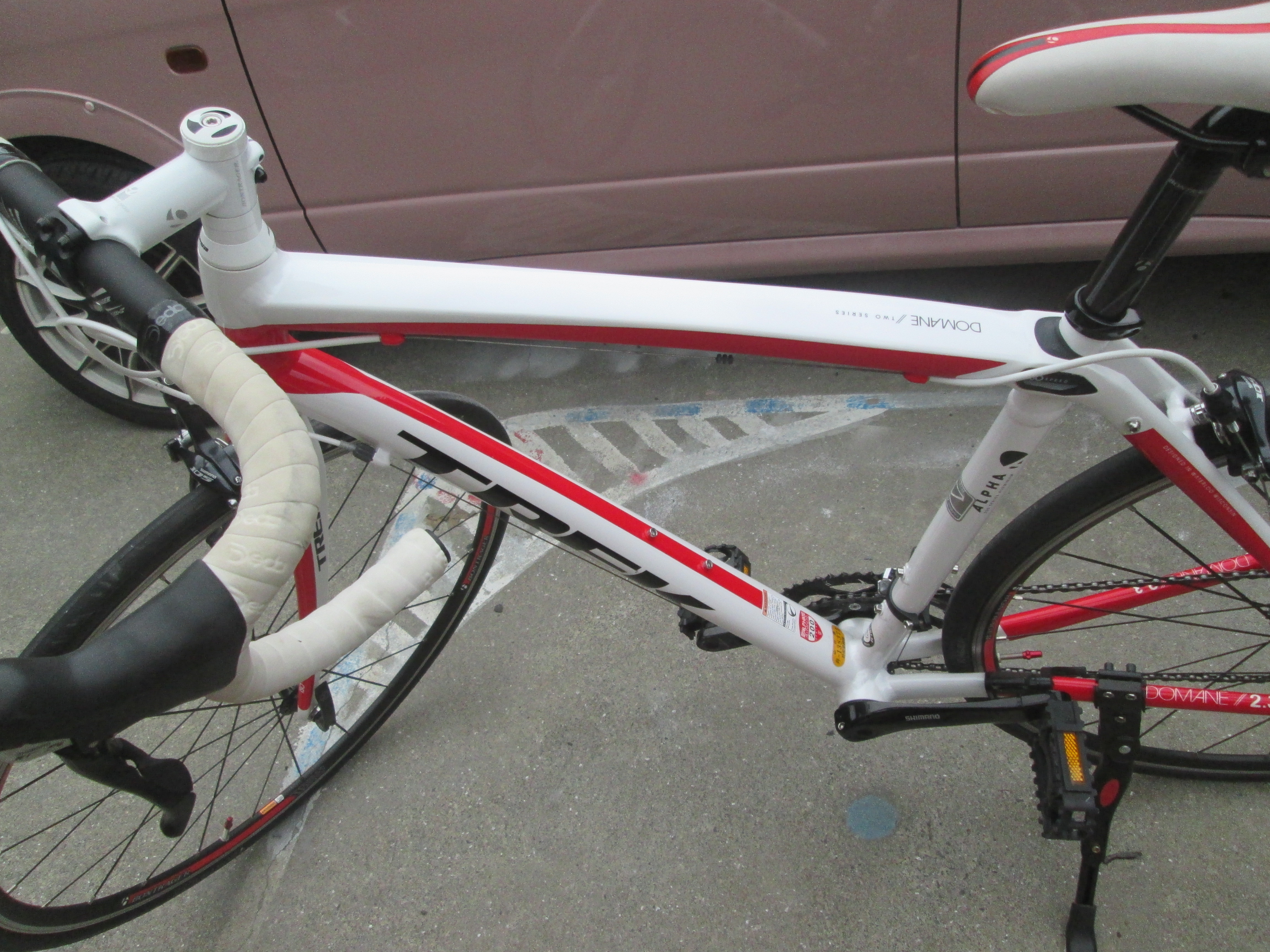 ロードバイク修正作業です。 フレームの上の部分にえぐれキズが数箇所・・・ かなり深い・・・塗膜が厚い! おまけにパールホワイトです。・・・赤色にも近いし・・・ キズをパテで修正、赤色と文字をマスキングしてパールホワイトの補修塗装。 マスキングを剥がし赤色と文字もクリヤで押さえます。段取をして仕上げのクリアで完成。 調色データーない色を合わせるのは、大変ですがキズが直ってオーナー様に喜んでいただき とても良かったです。