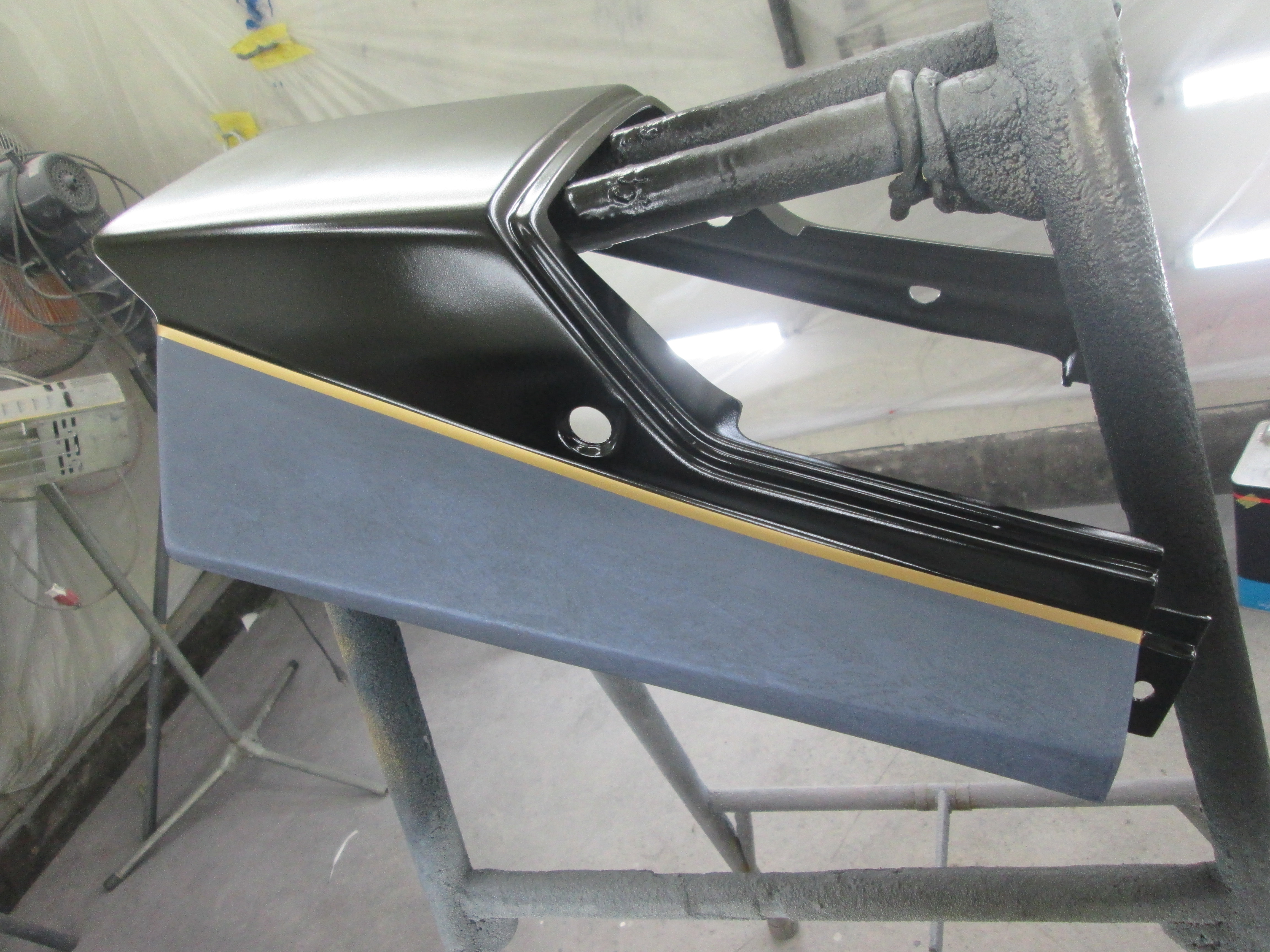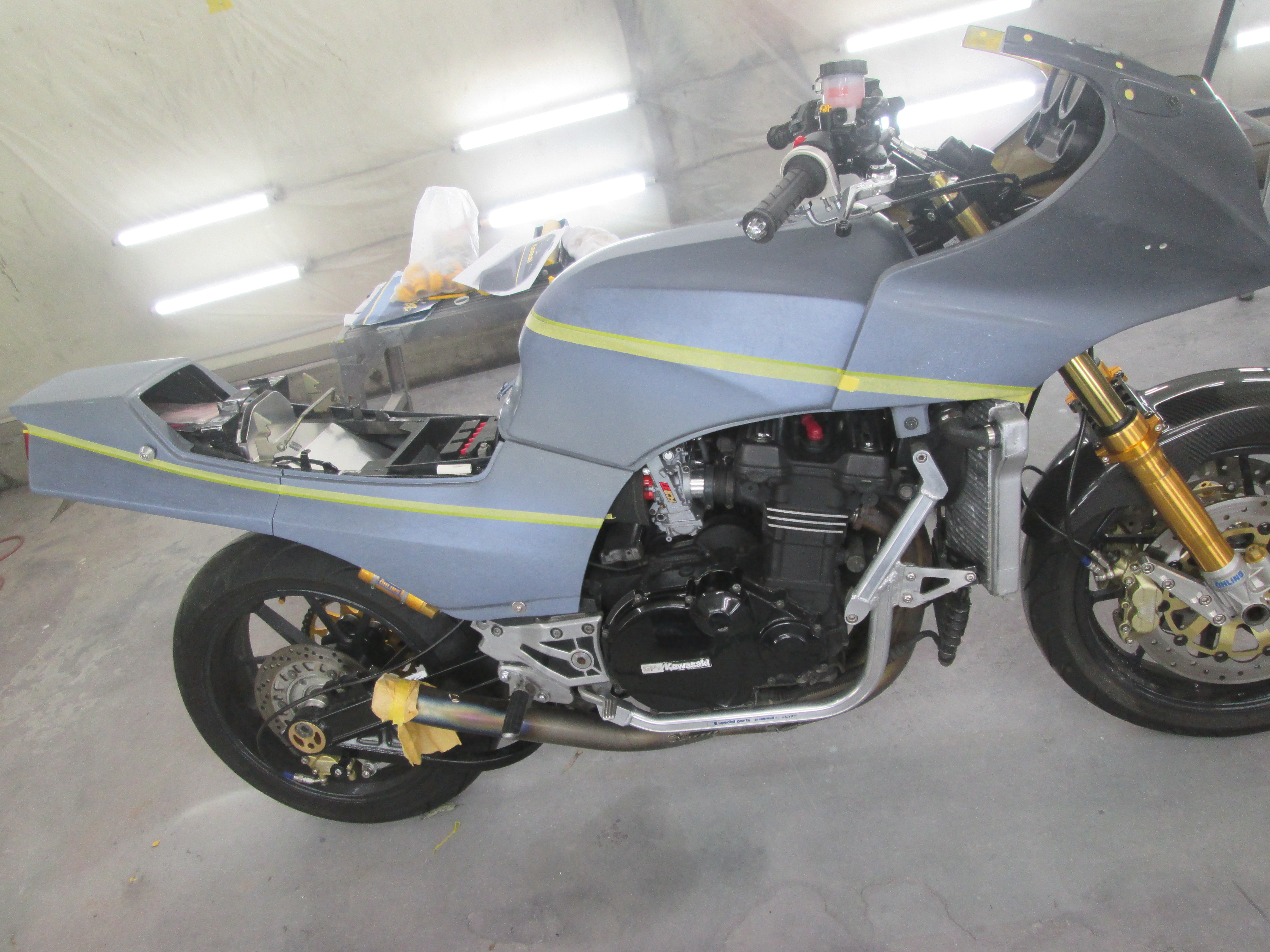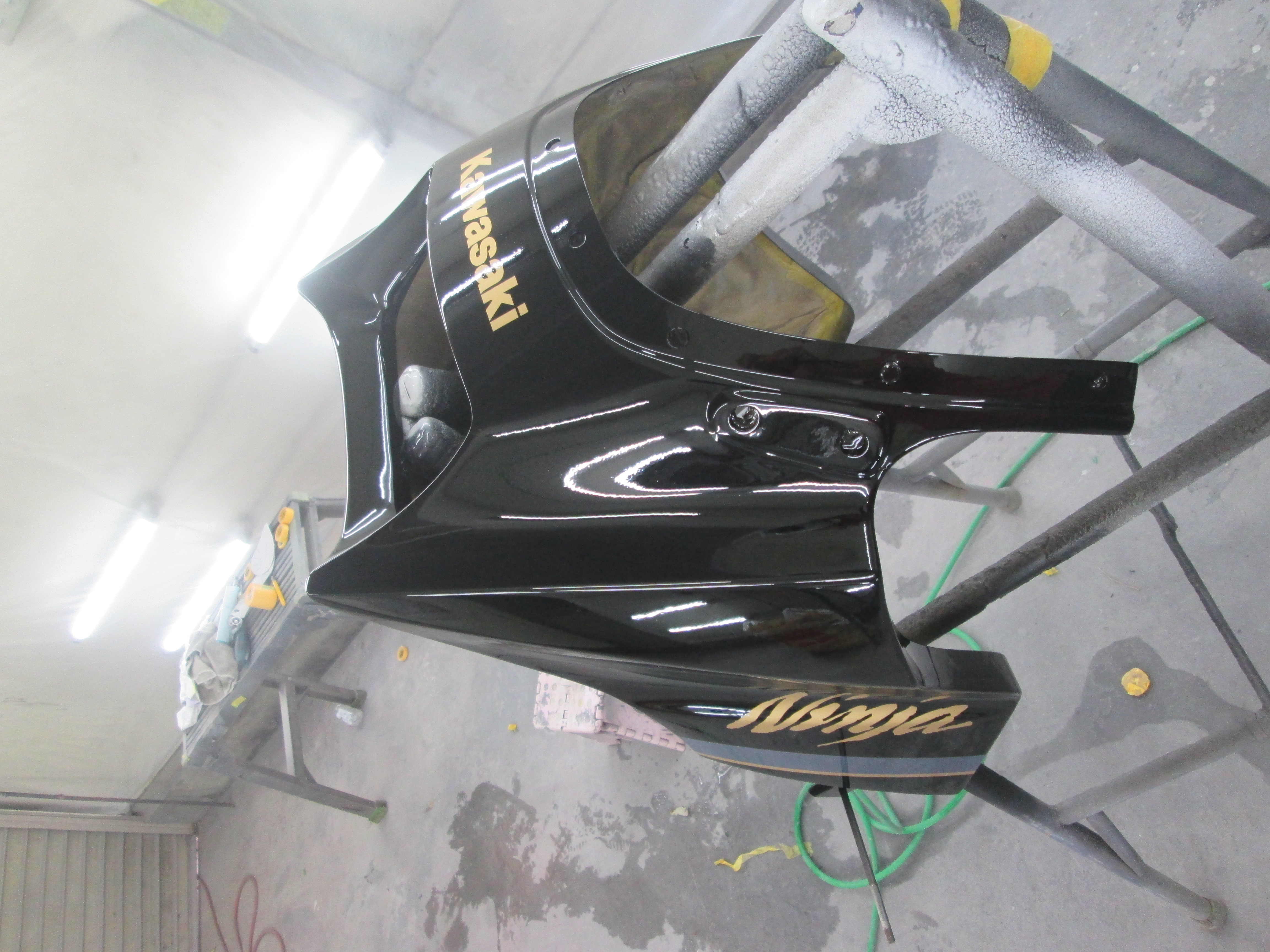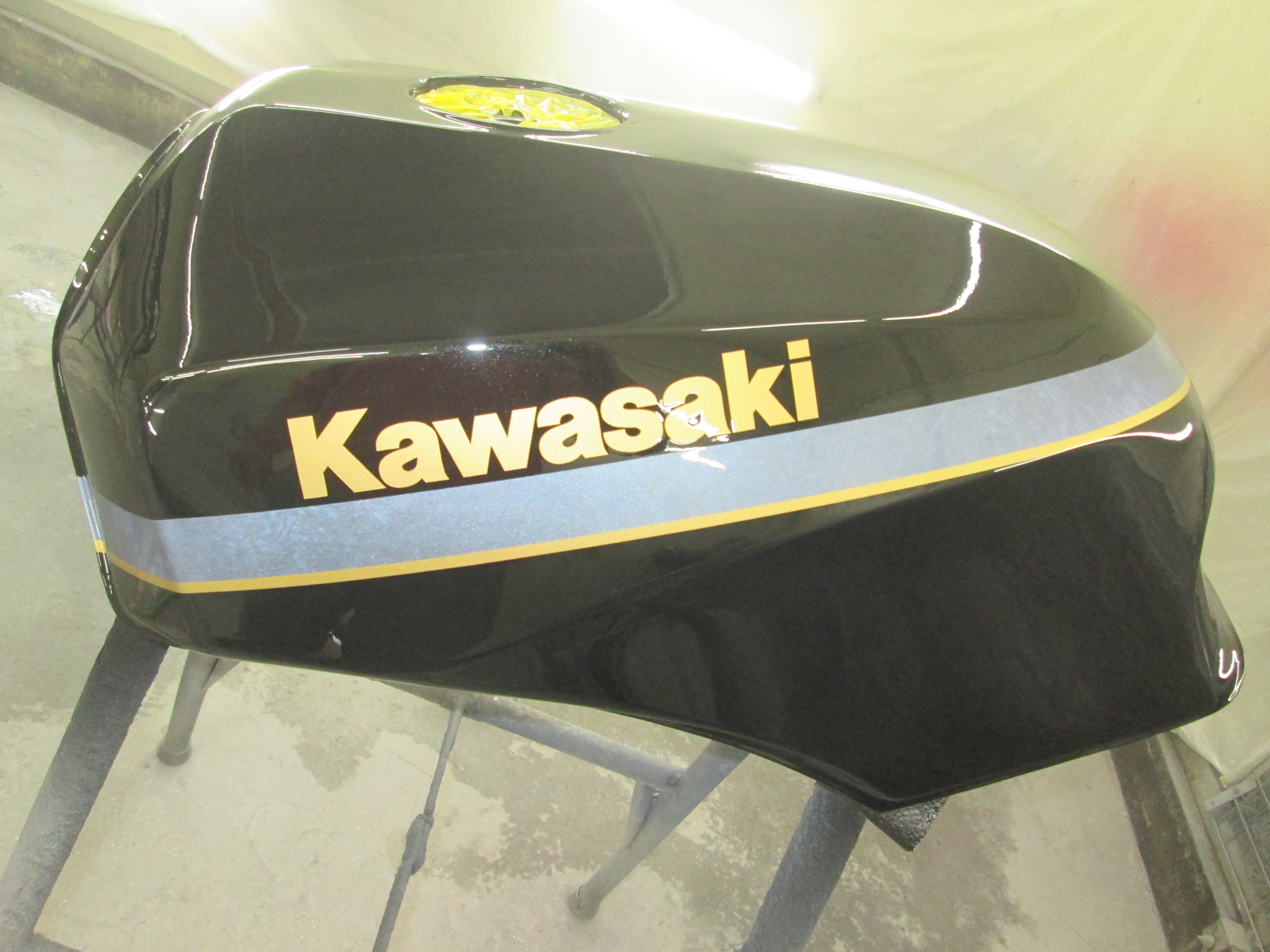 カワサキGPZ900改 赤色のツートンから黒/シルバーに変更・・・ シルバーベースには、少量のブルーを添加 その上からブルーパールでラップ仕上げです。 一度組立ててラインを位置決めしてゴールドを塗装します。 黒には、ガラスパウダーを少量、・・・ ゴールドで、ロゴを入れてクリアです。 ニンジャ好きですね~ 組立てて完成です。 サス、ブレーキ、キャブとか、かなりきてますね~ まだまだ進化するそうです 楽しみですね。