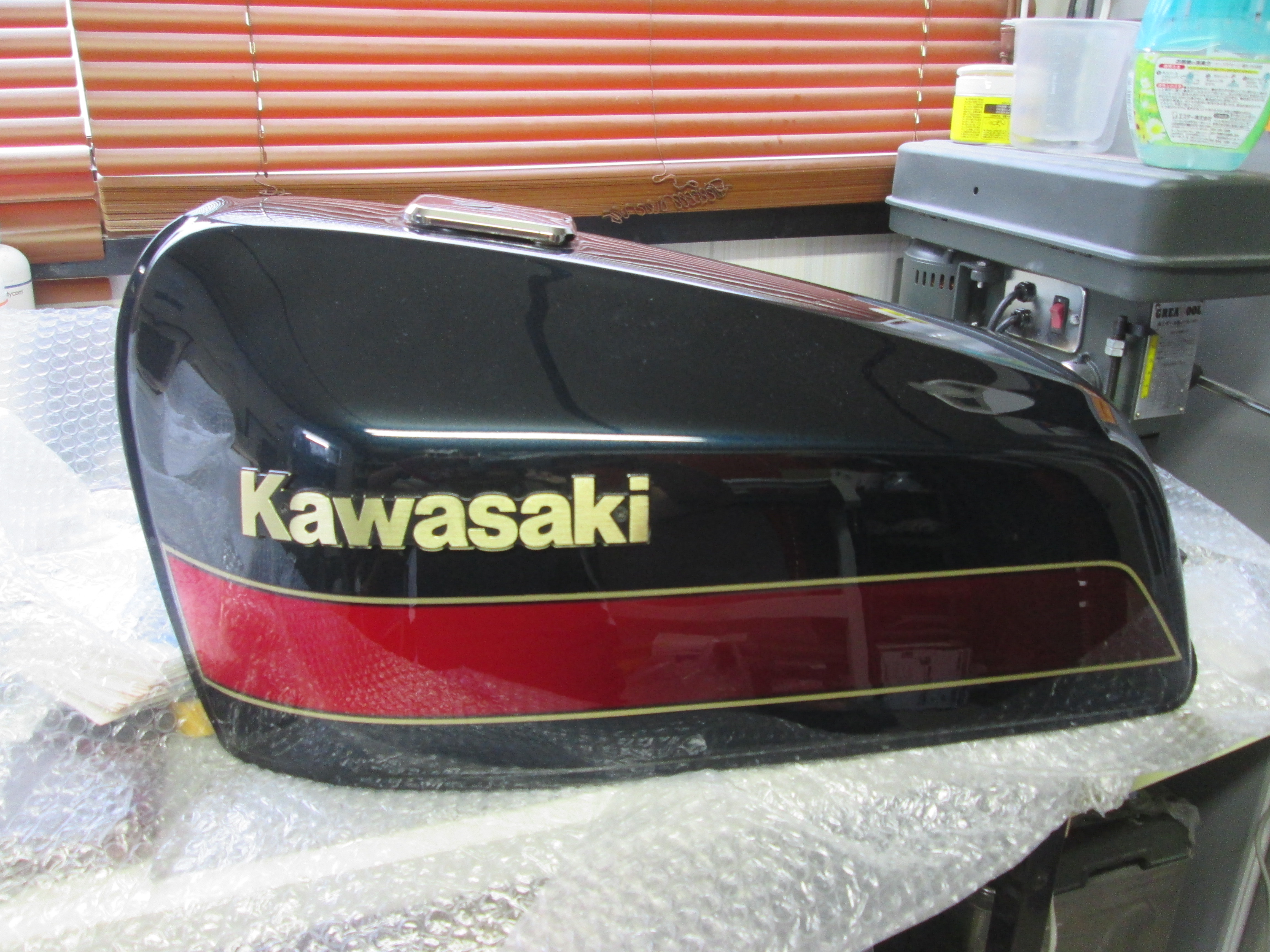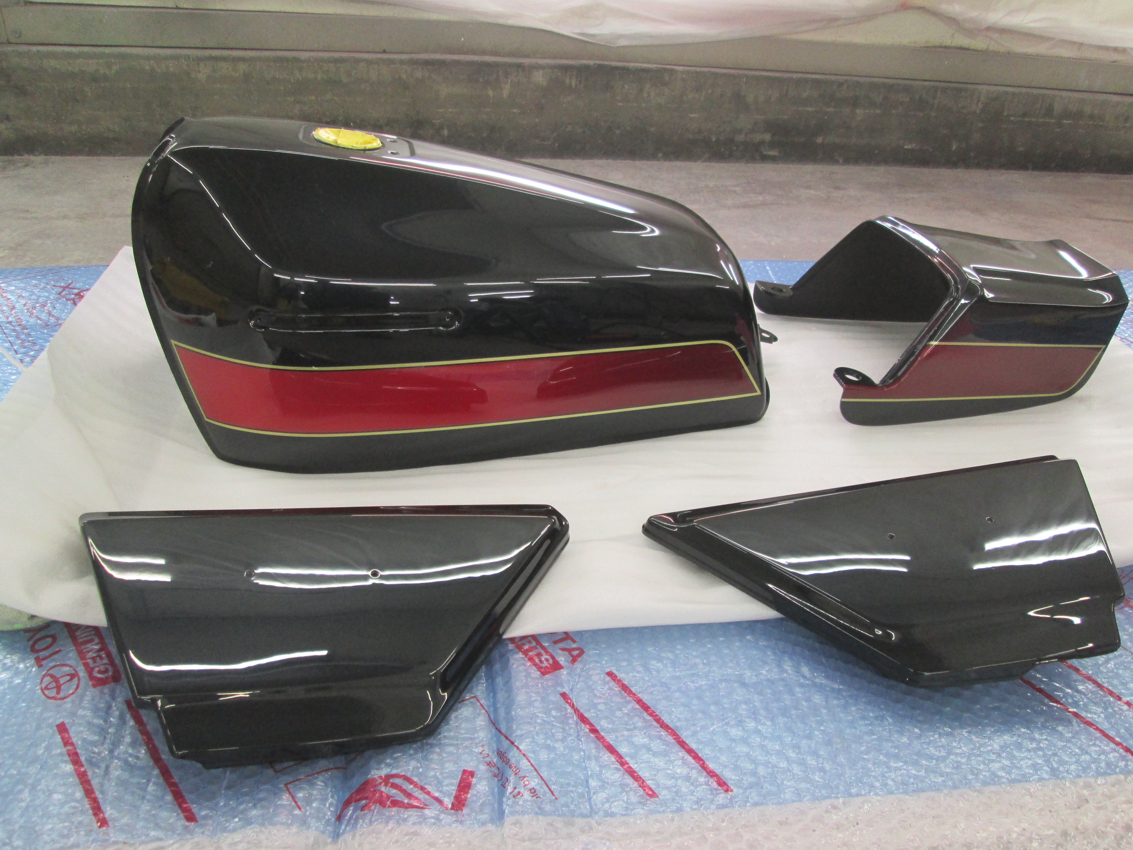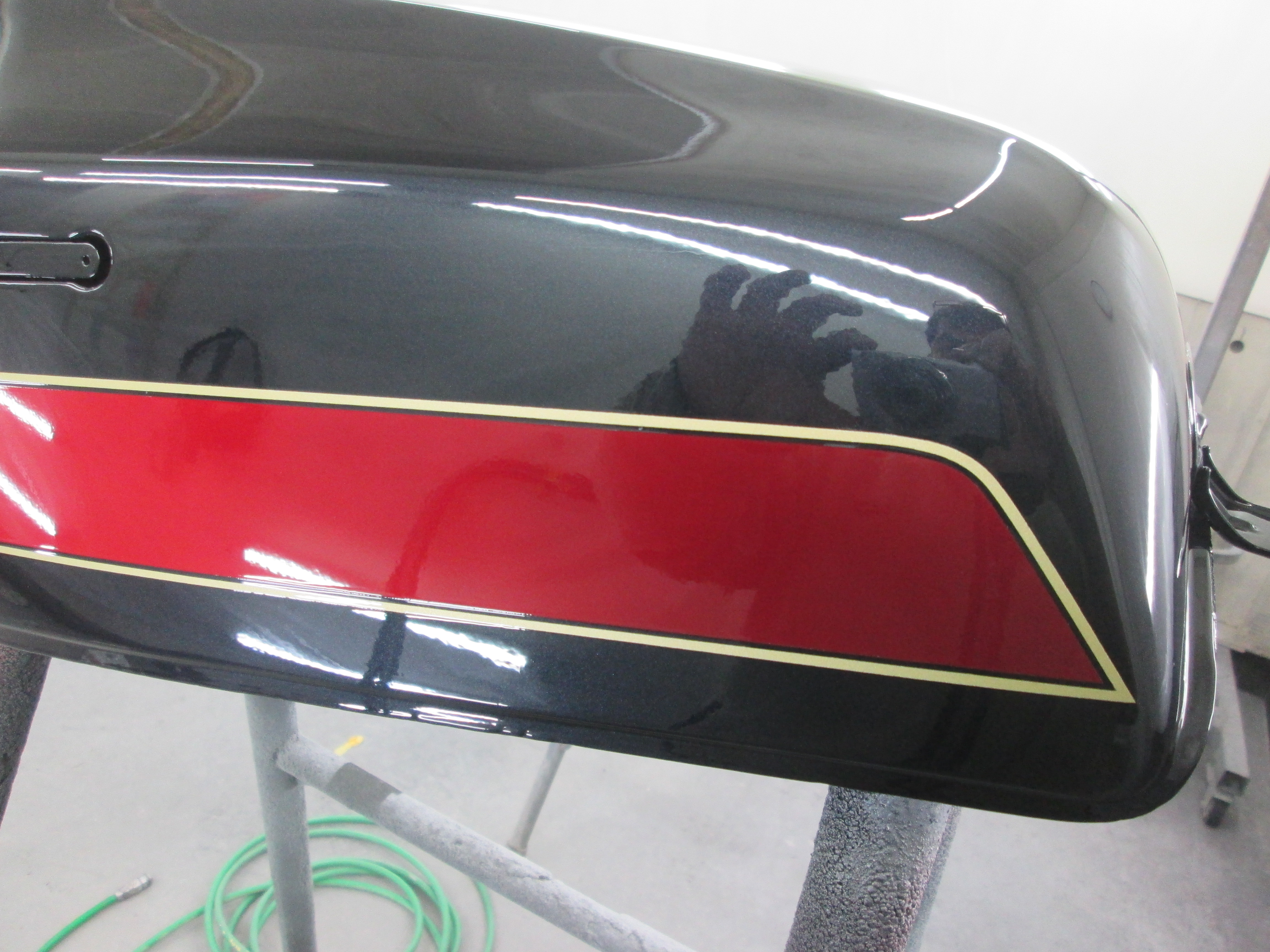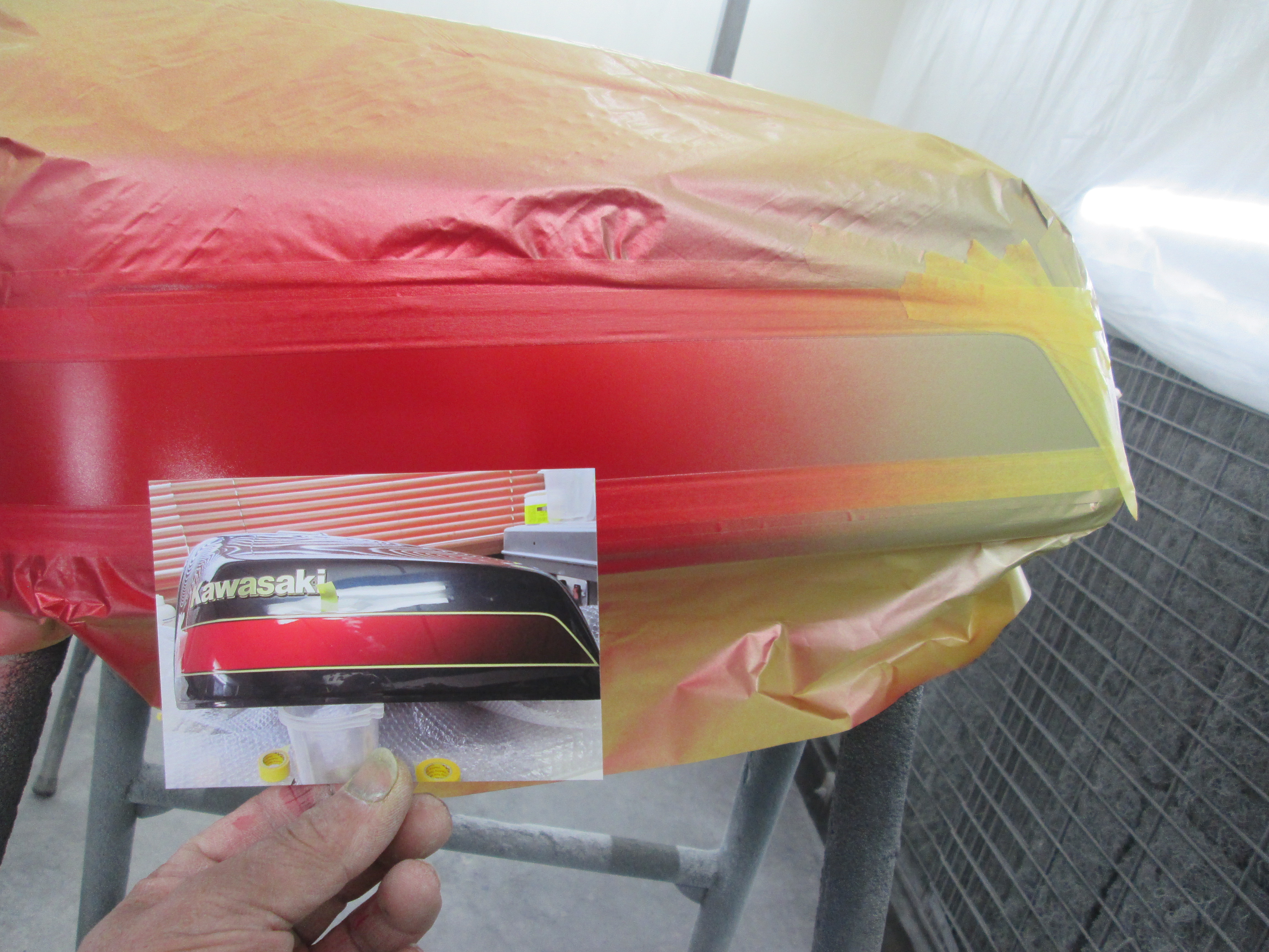 カワサキZ400FX ゲロゲロ・・・速攻、ブラストです。 お借りした、タンクとカウルのライン寸法計測、ベースカラーとラインの色合わせ作業です。 ベースを塗りラインのマスキング・・・ 大きなRが難しいです・・・ 始めにゴールド 次に、パールレッド・・・で濃いパールレッドをグラデイションします。 カウルモ同じく・・・ クリアで完成。 Nobuさんに納品です。完成が楽しみですね。