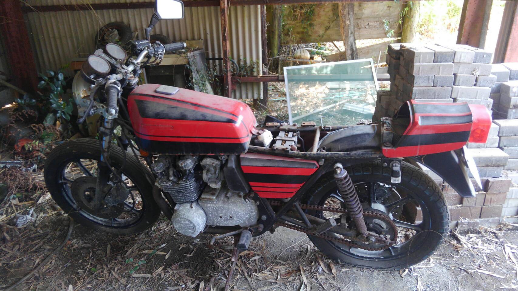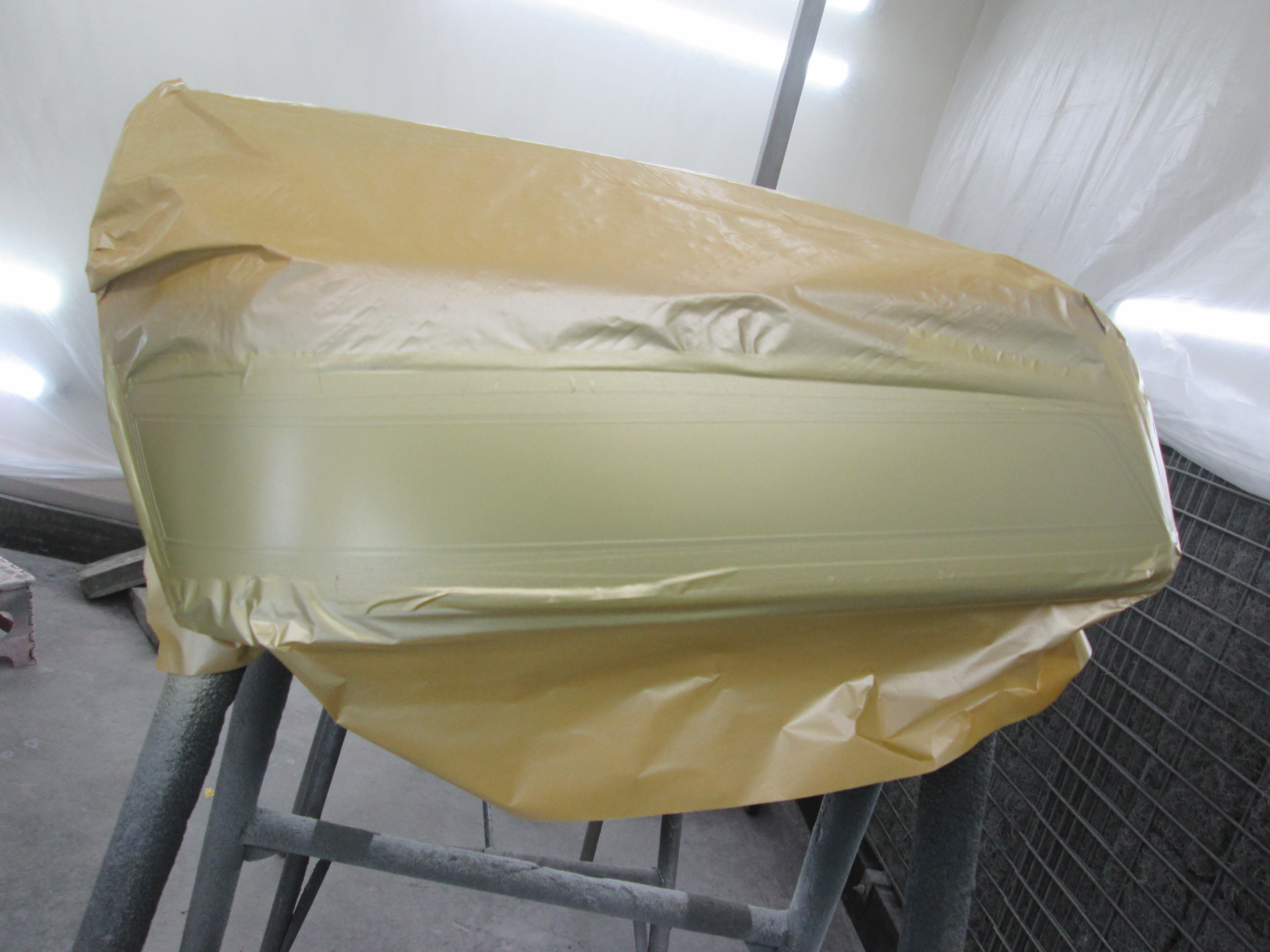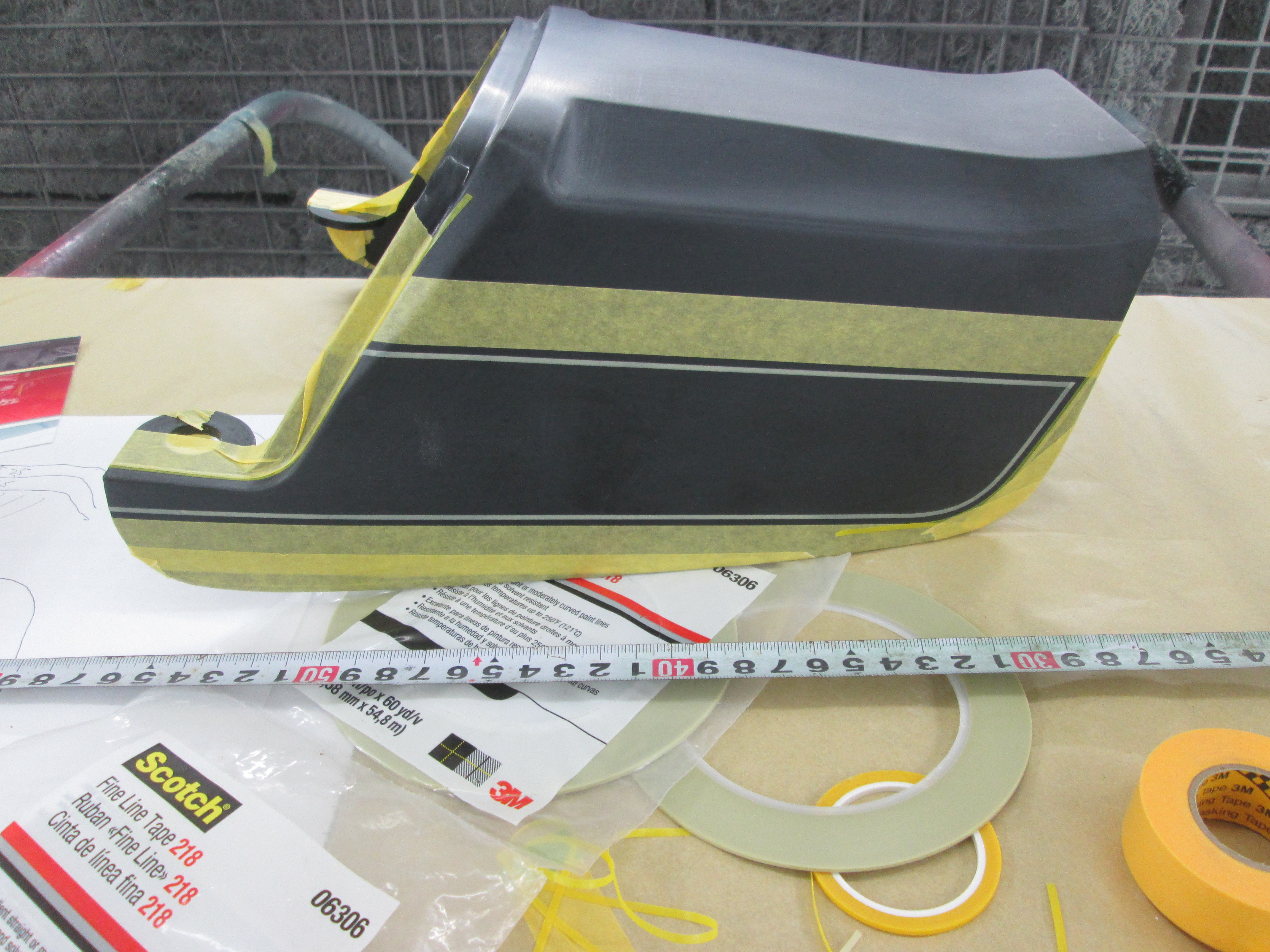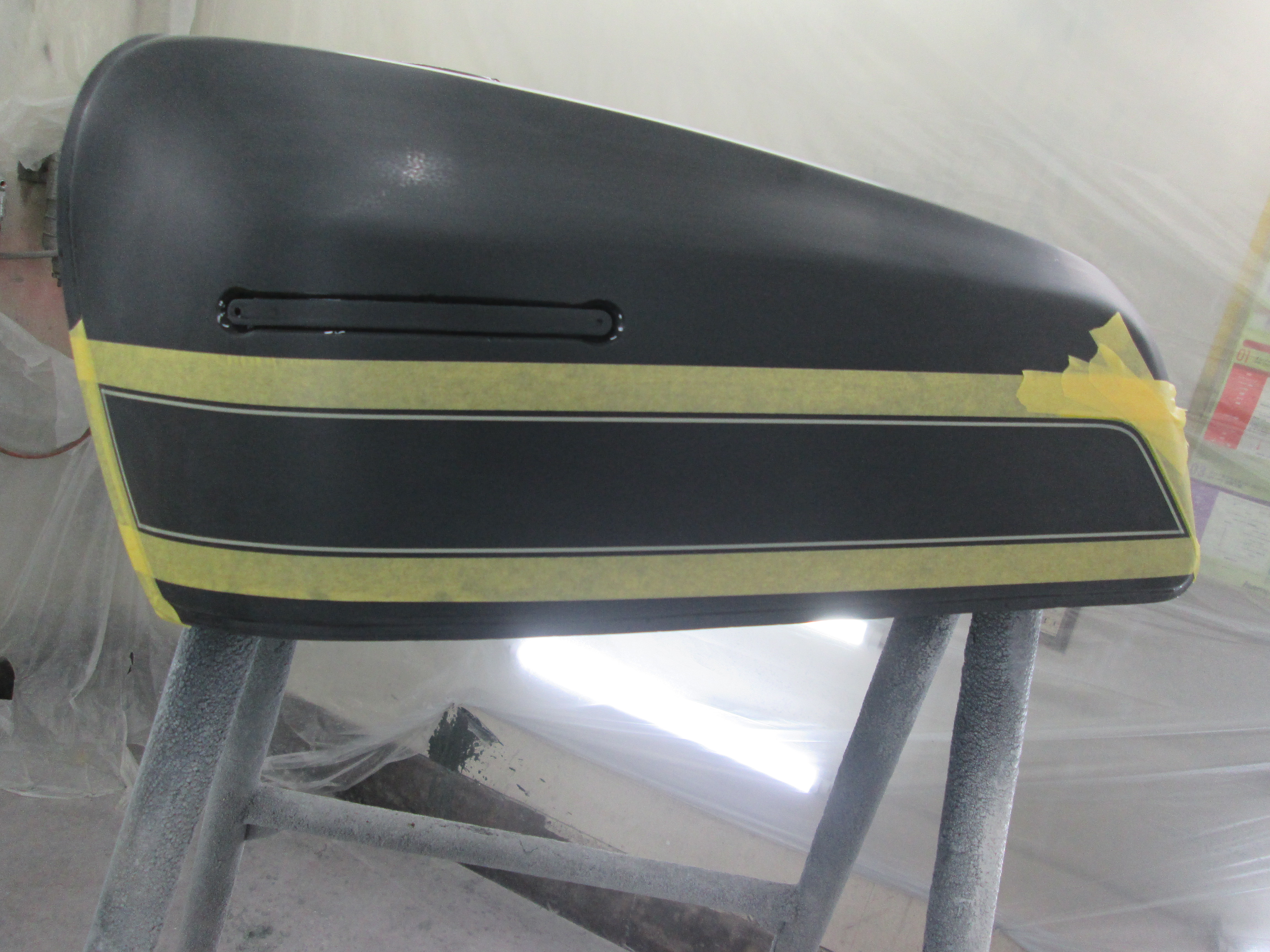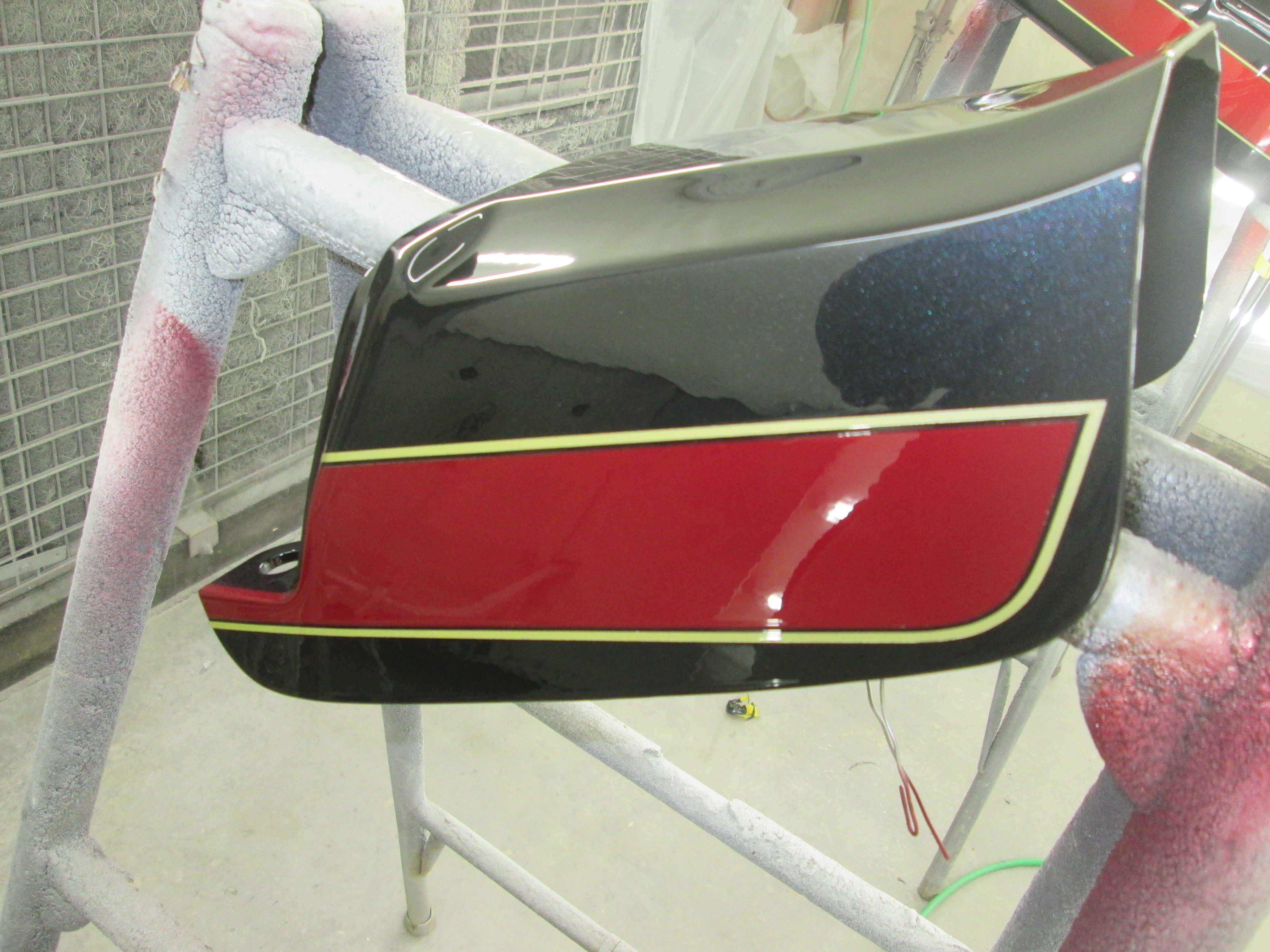 カワサキZ400FX ゲロゲロ・・・速攻、ブラストです。 お借りした、タンクとカウルのライン寸法計測、ベースカラーとラインの色合わせ作業です。 ベースを塗りラインのマスキング・・・ 大きなRが難しいです・・・ 始めにゴールド 次に、パールレッド・・・で濃いパールレッドをグラデイションします。 カウルモ同じく・・・ クリアで完成。 Nobuさんに納品です。完成が楽しみですね。