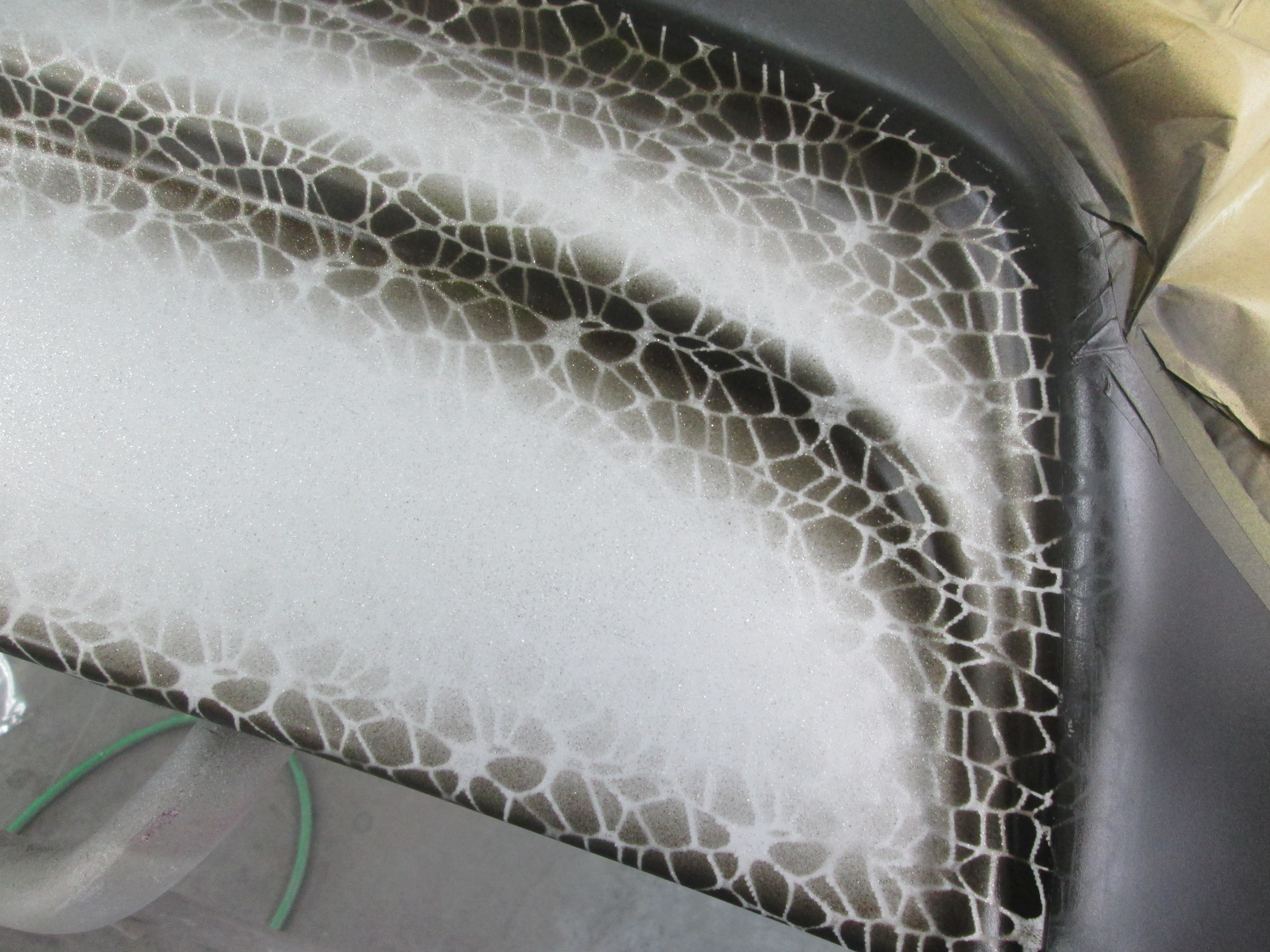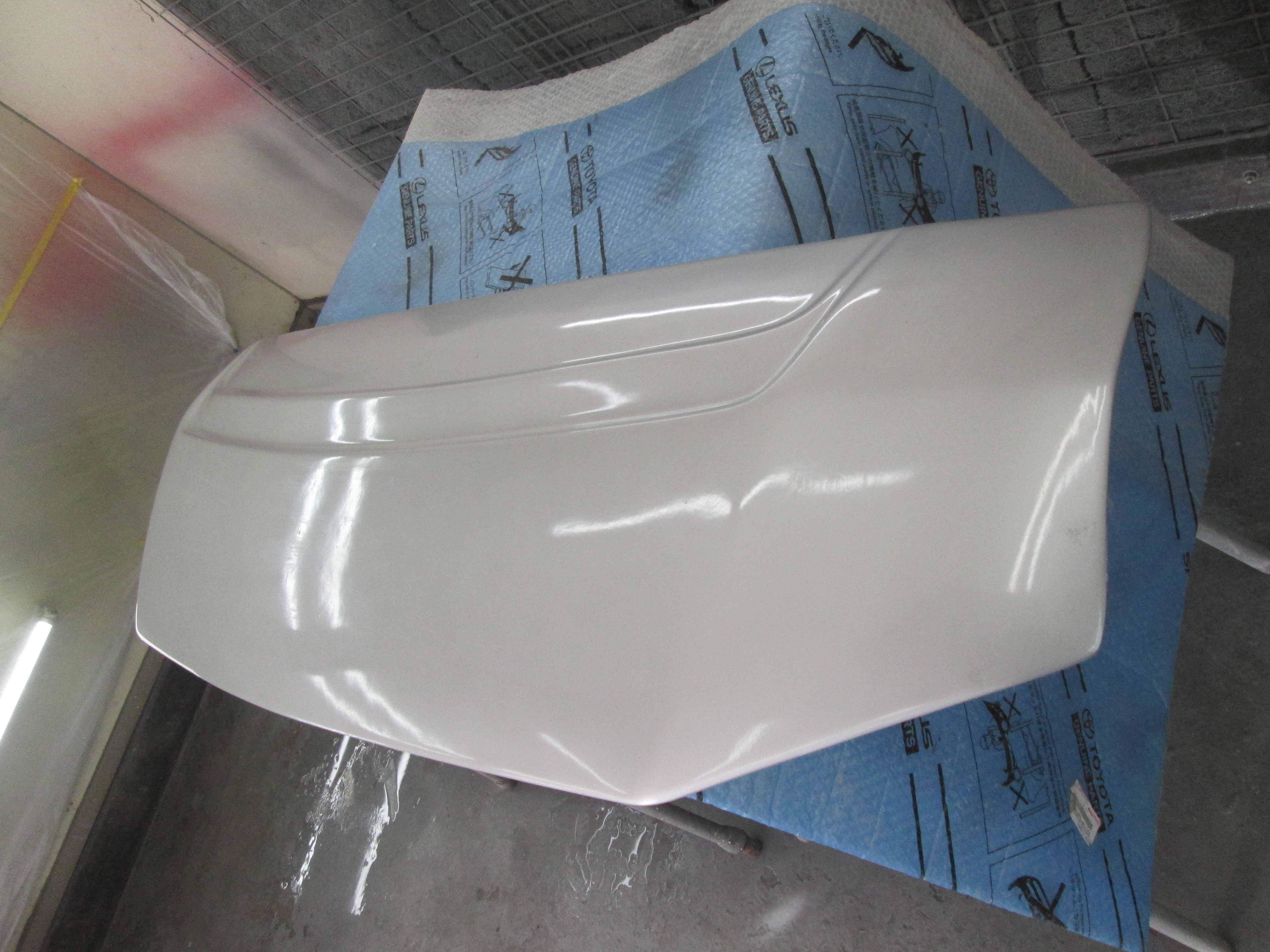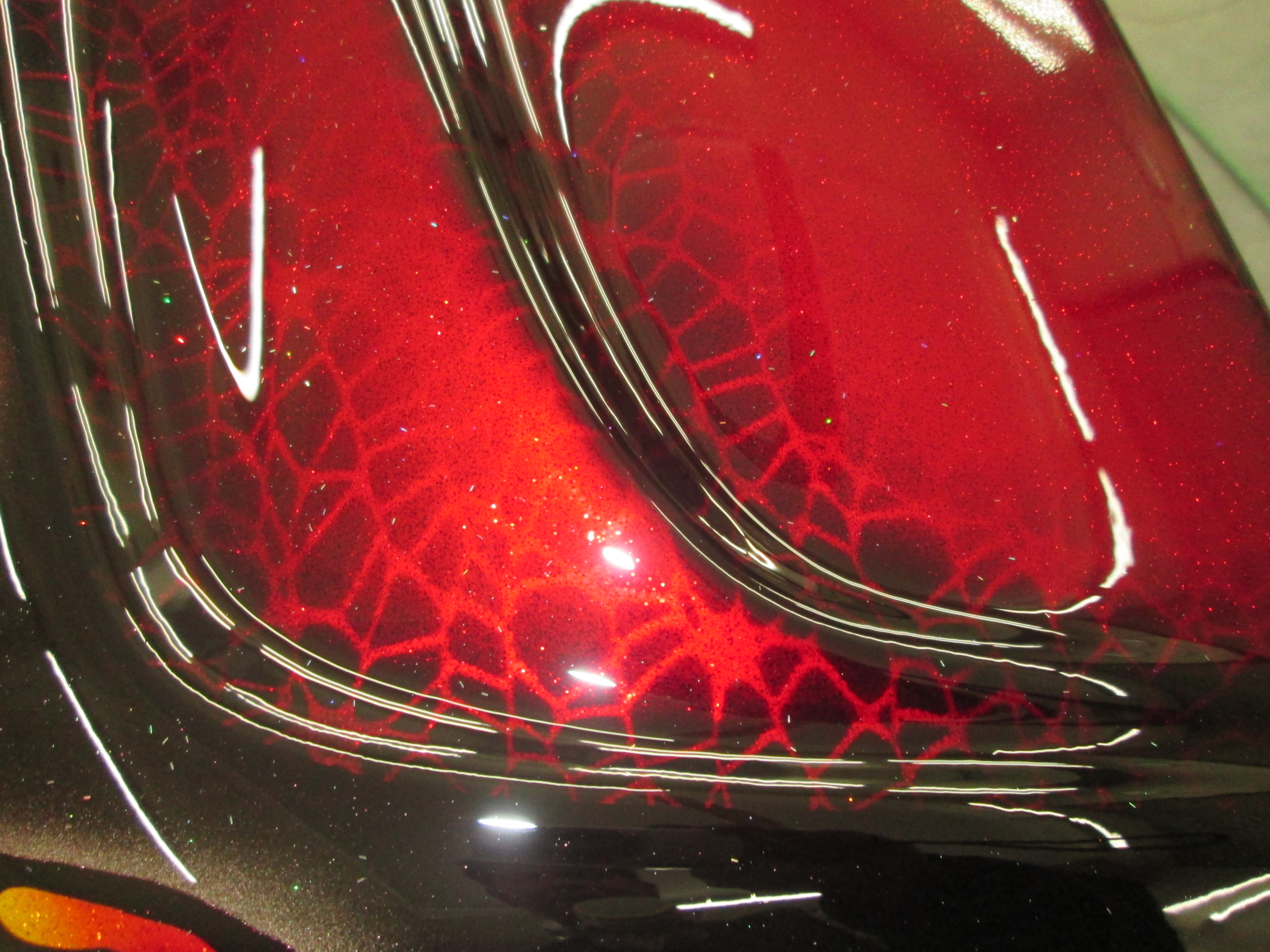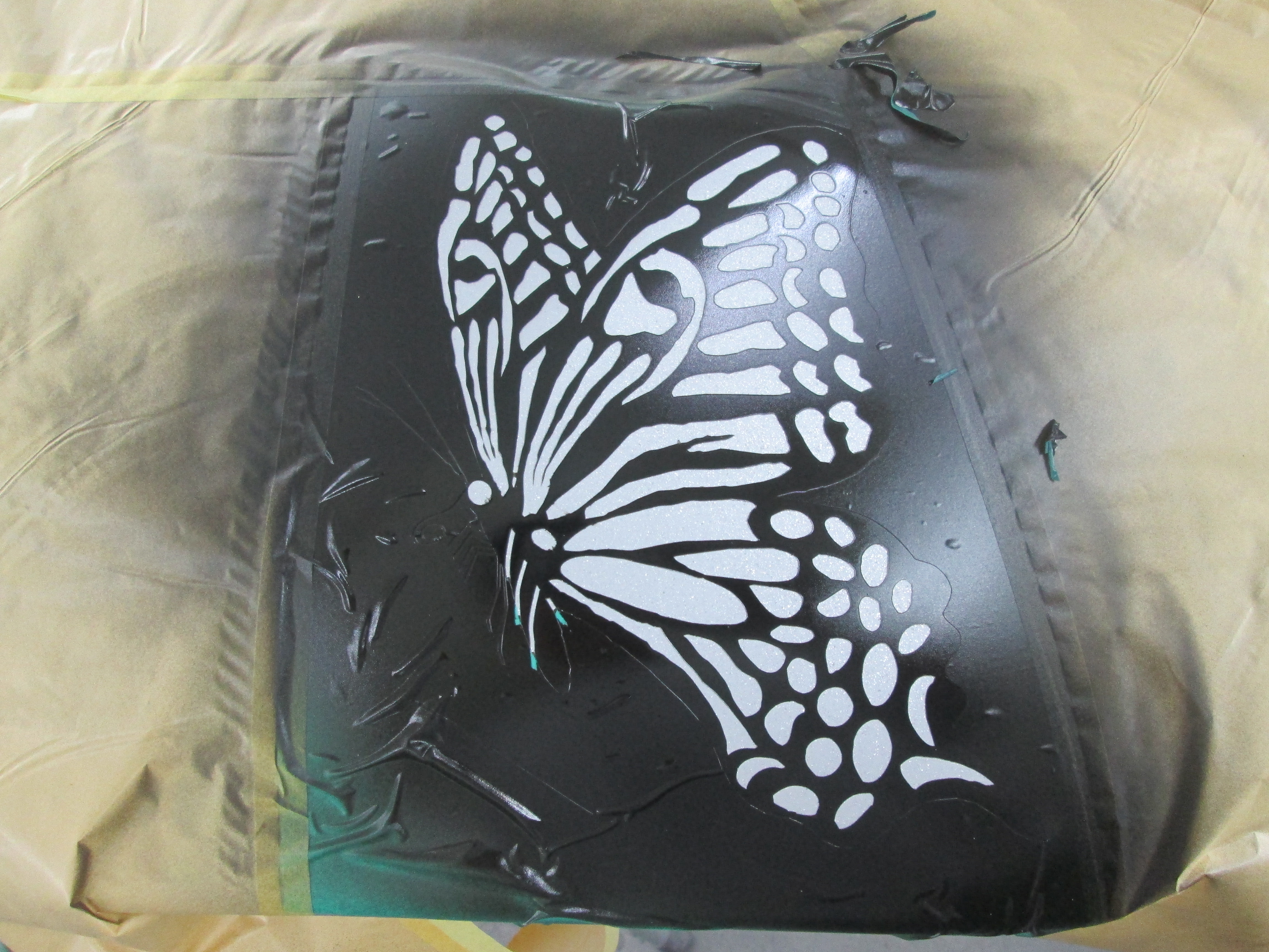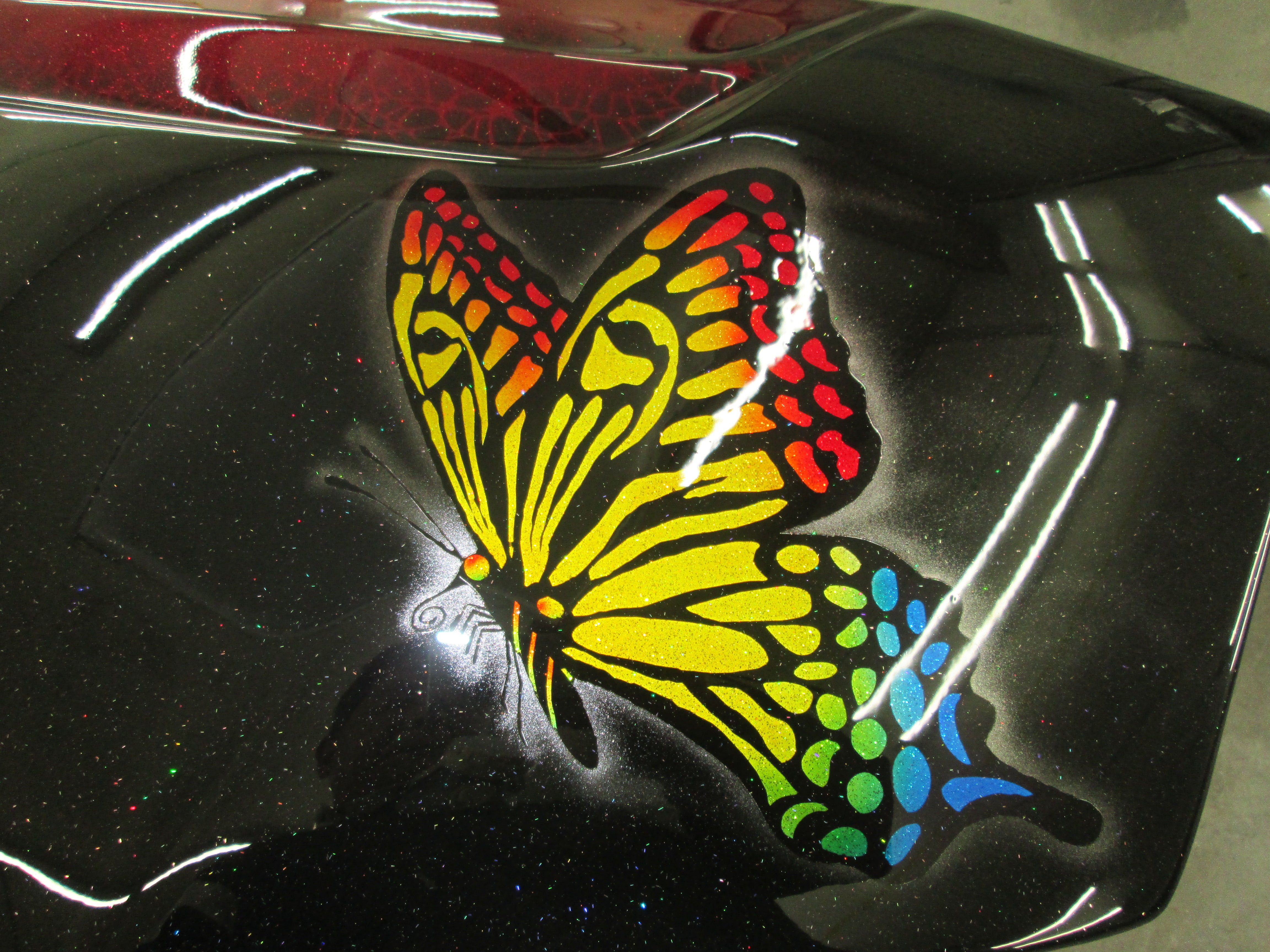 ハイエースのFRPボンネットの塗装です。 キャンディカラーの下色にシルバーフレークを塗ります。 いきなり蝶々! 左側に薔薇 スリット部分にまだら模様・・・ 上からキャンディレッド・・・レインボウフレークを少々・・・ レインボウフレイクブラックの上に蝶々、縁を細目のシルバーフレーク少々・・・蝶々にキャンディレッド・ブルー・イエローの順にペイント・・・レインボウフレイク少々・・・ 薔薇もキャンディカラーをレッド・イエロー・グリーンの順にペイント・・・ 段取クリア2回、仕上げのクリアで完成です。