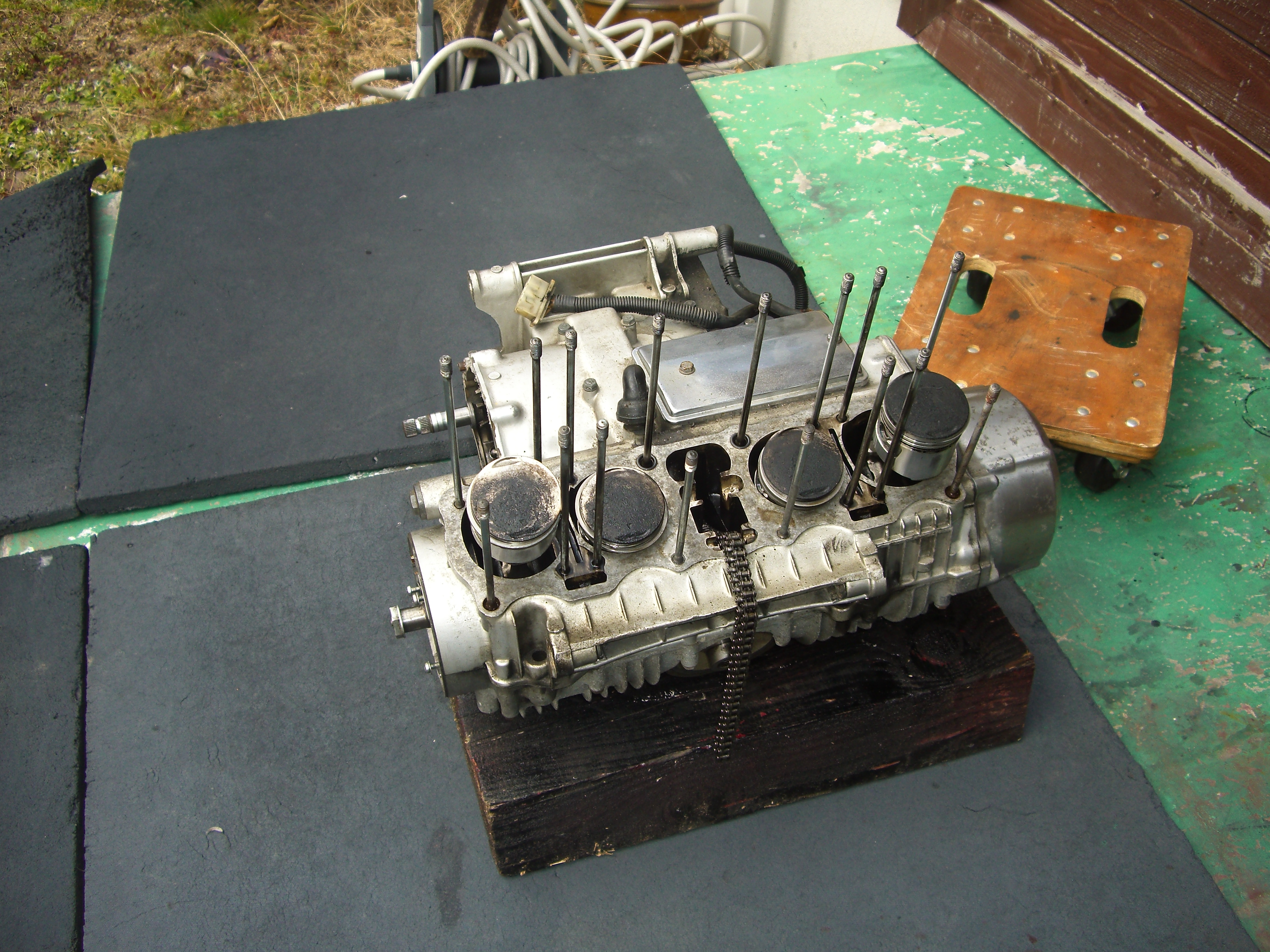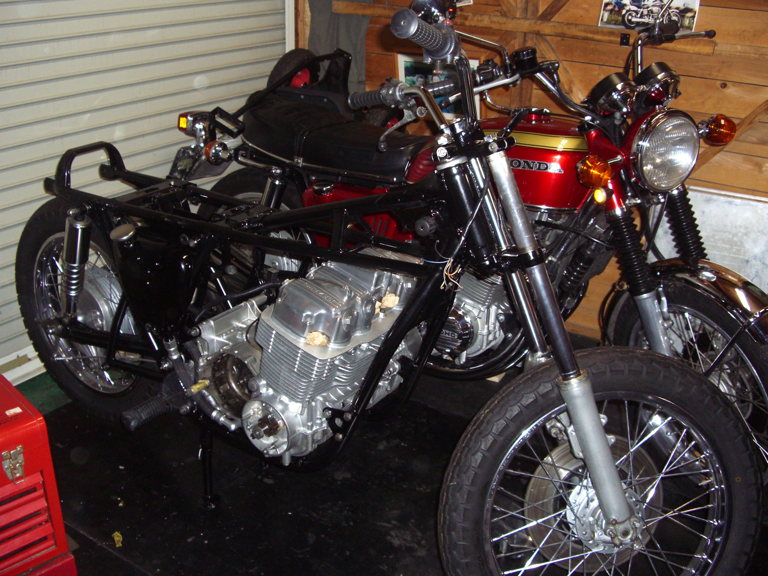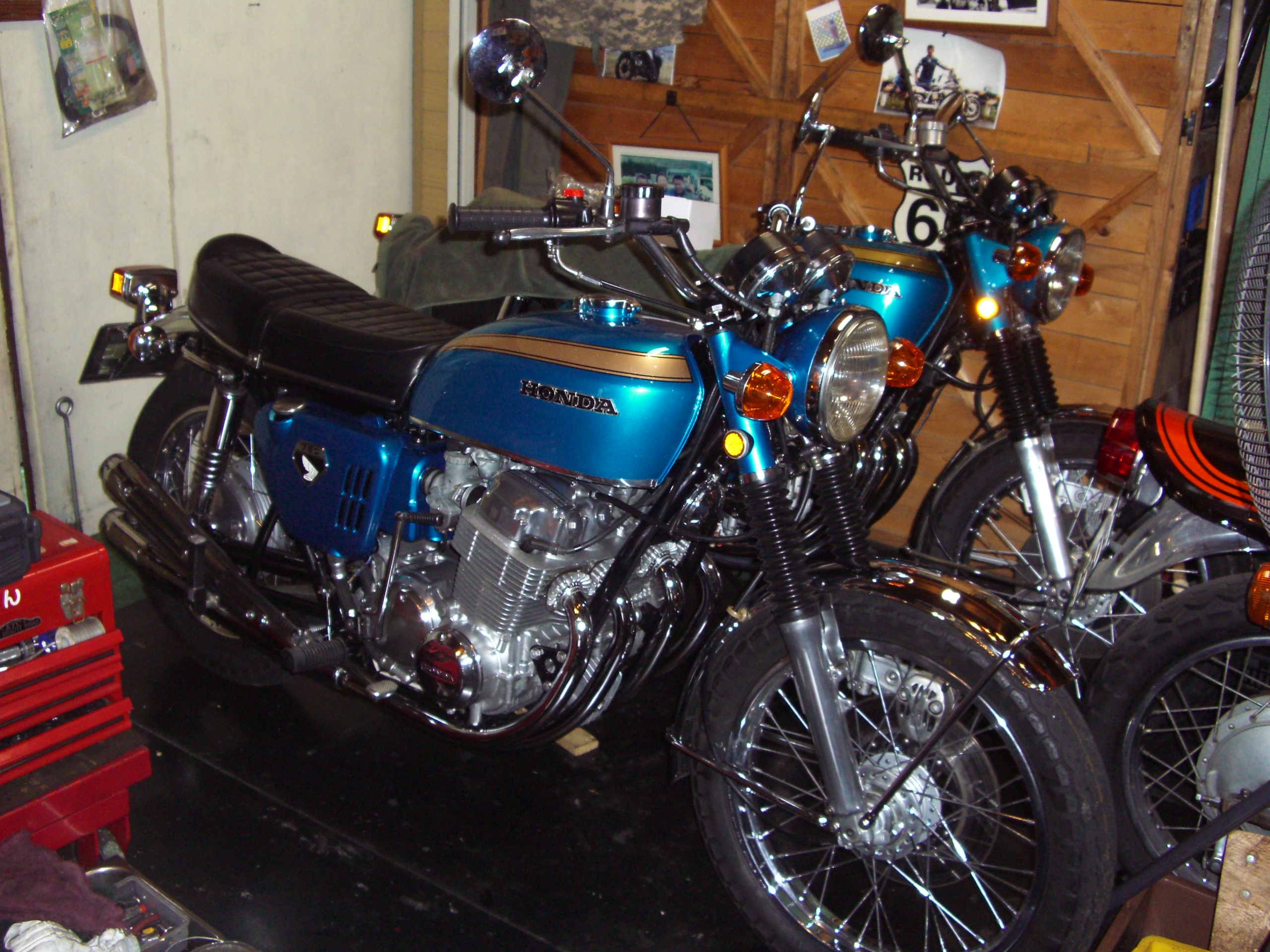 いつもお世話になっている、Nobuさんのレストア日記の一部です。 ホンダCB750 エンジン分解、 OILが・・・ 汚れてます・・・ コンディションは、良いほうですかね? 分解して行きます。 まる裸、 ヘッドの掃除、 ポリッシュして組上げて・・・ フレームに乗せて、 組立て終了、完成。・・・?同じ色のCBが、2台・・・どちらもピカピカです。