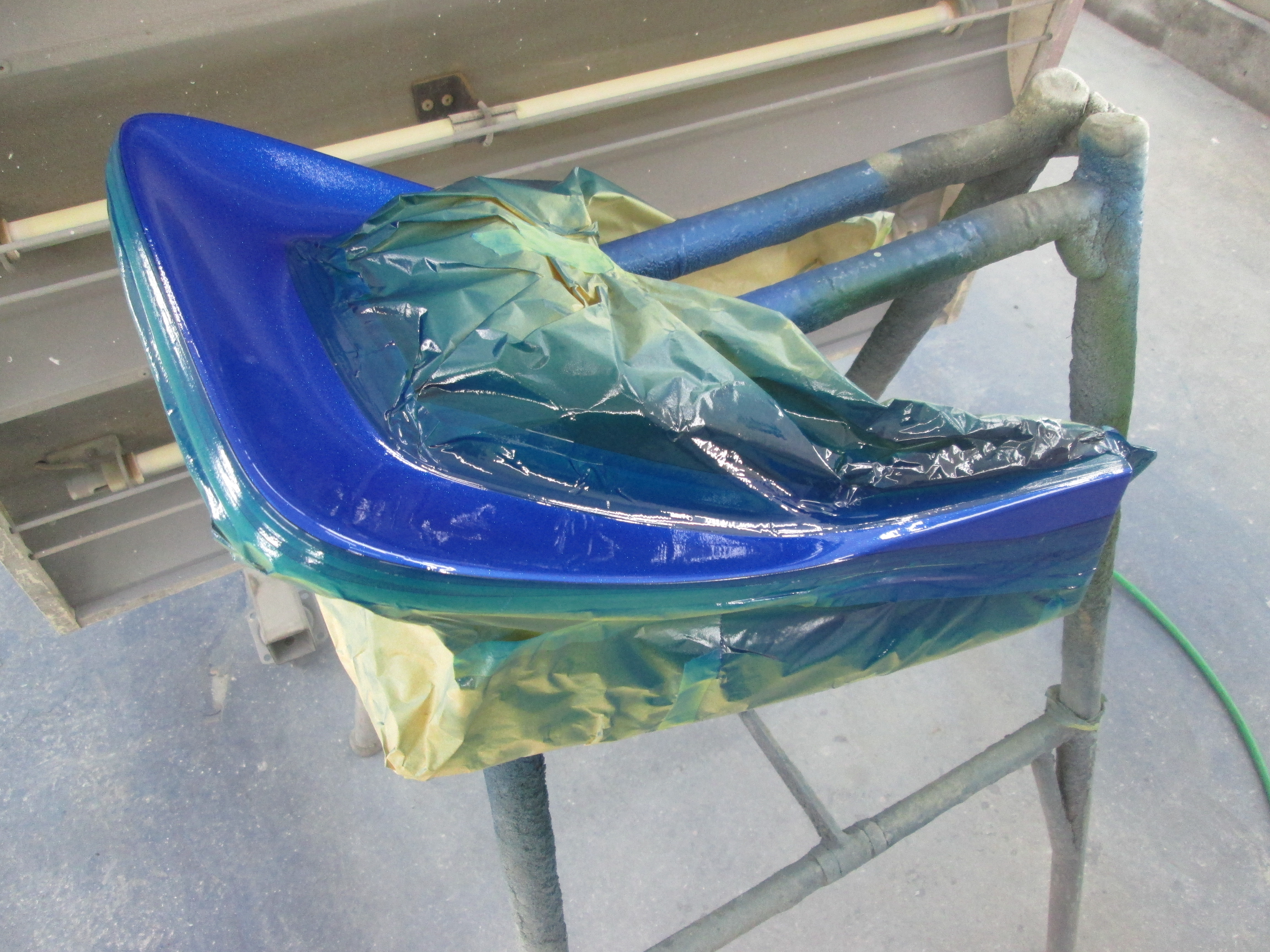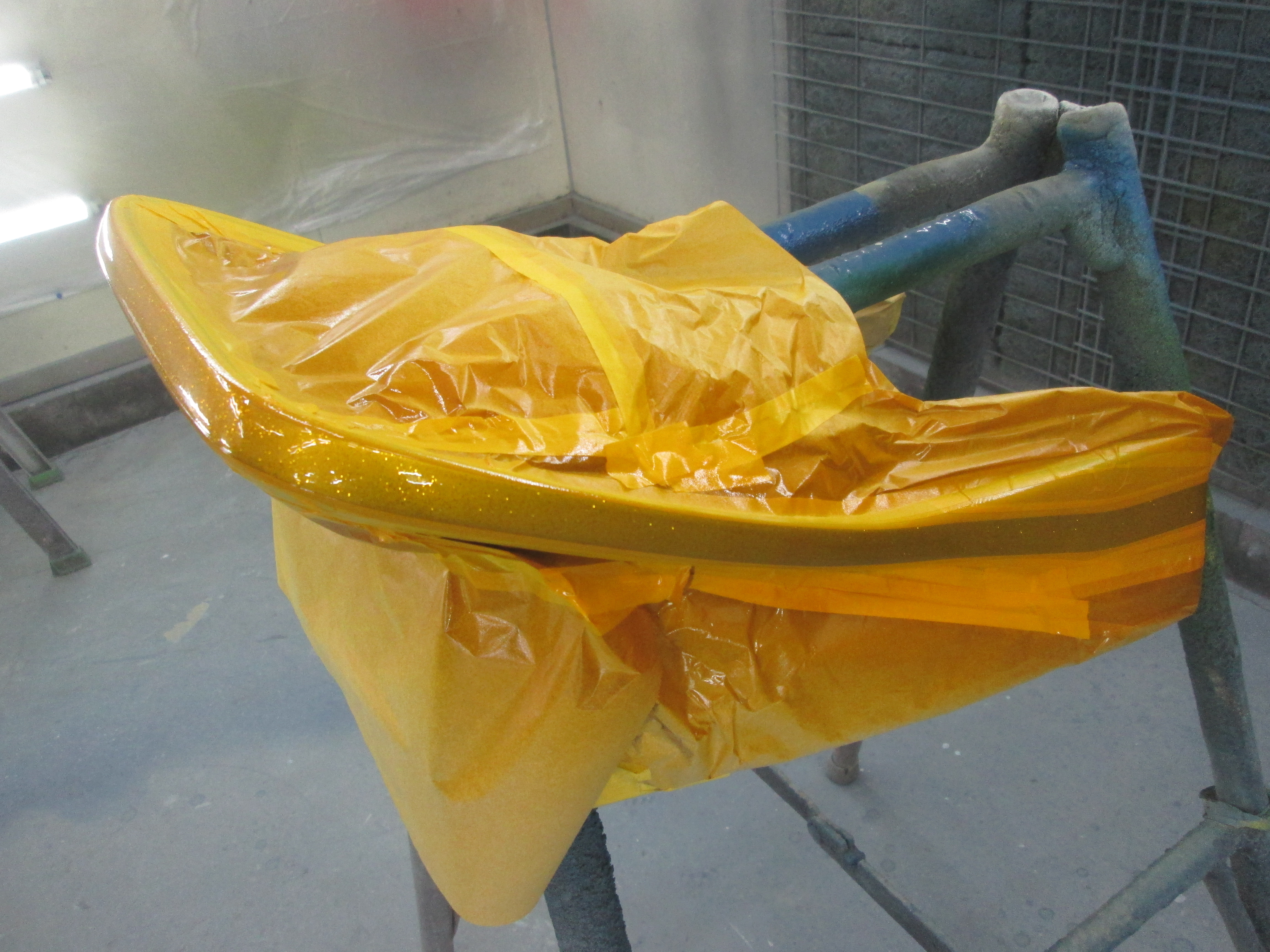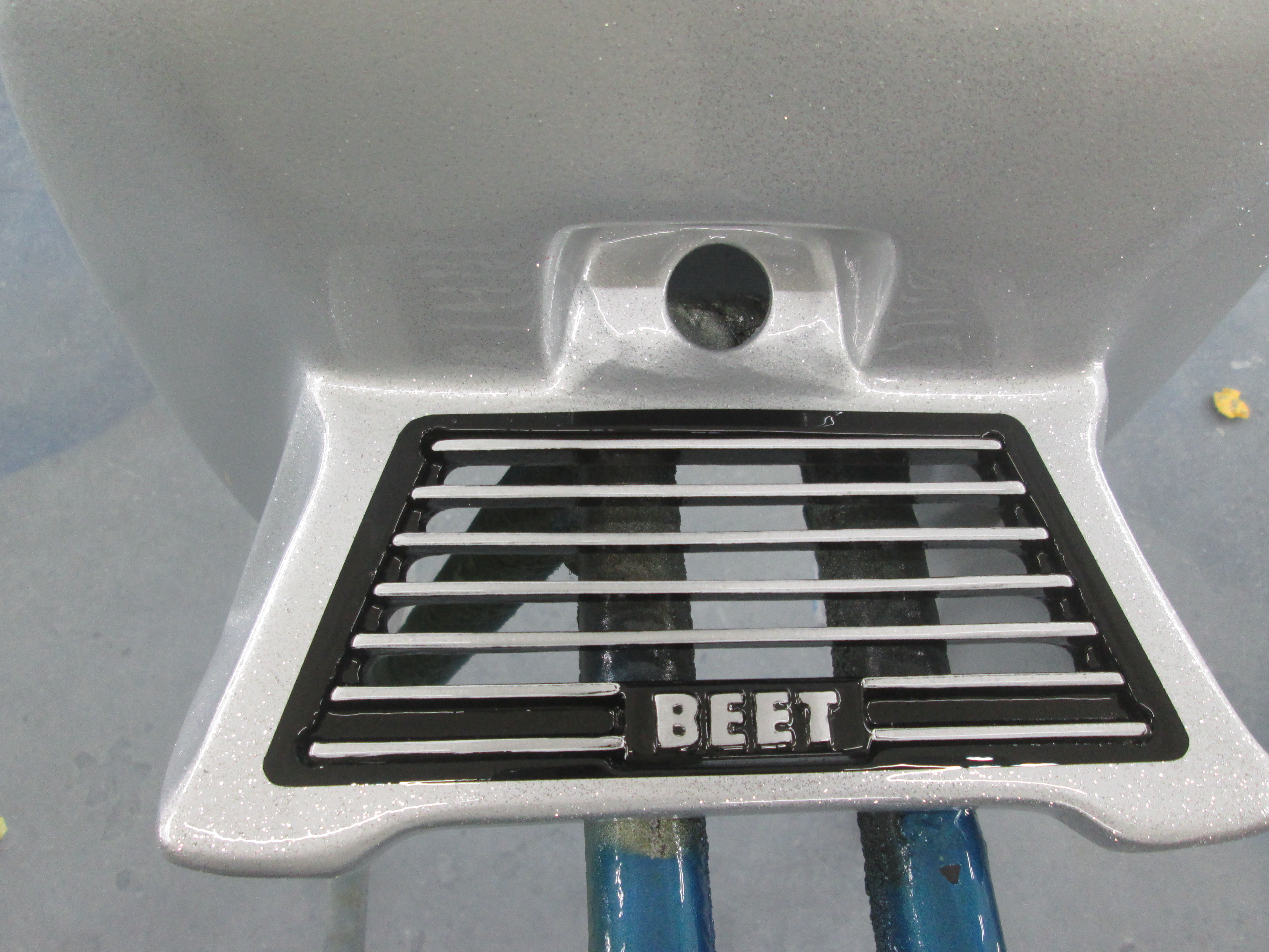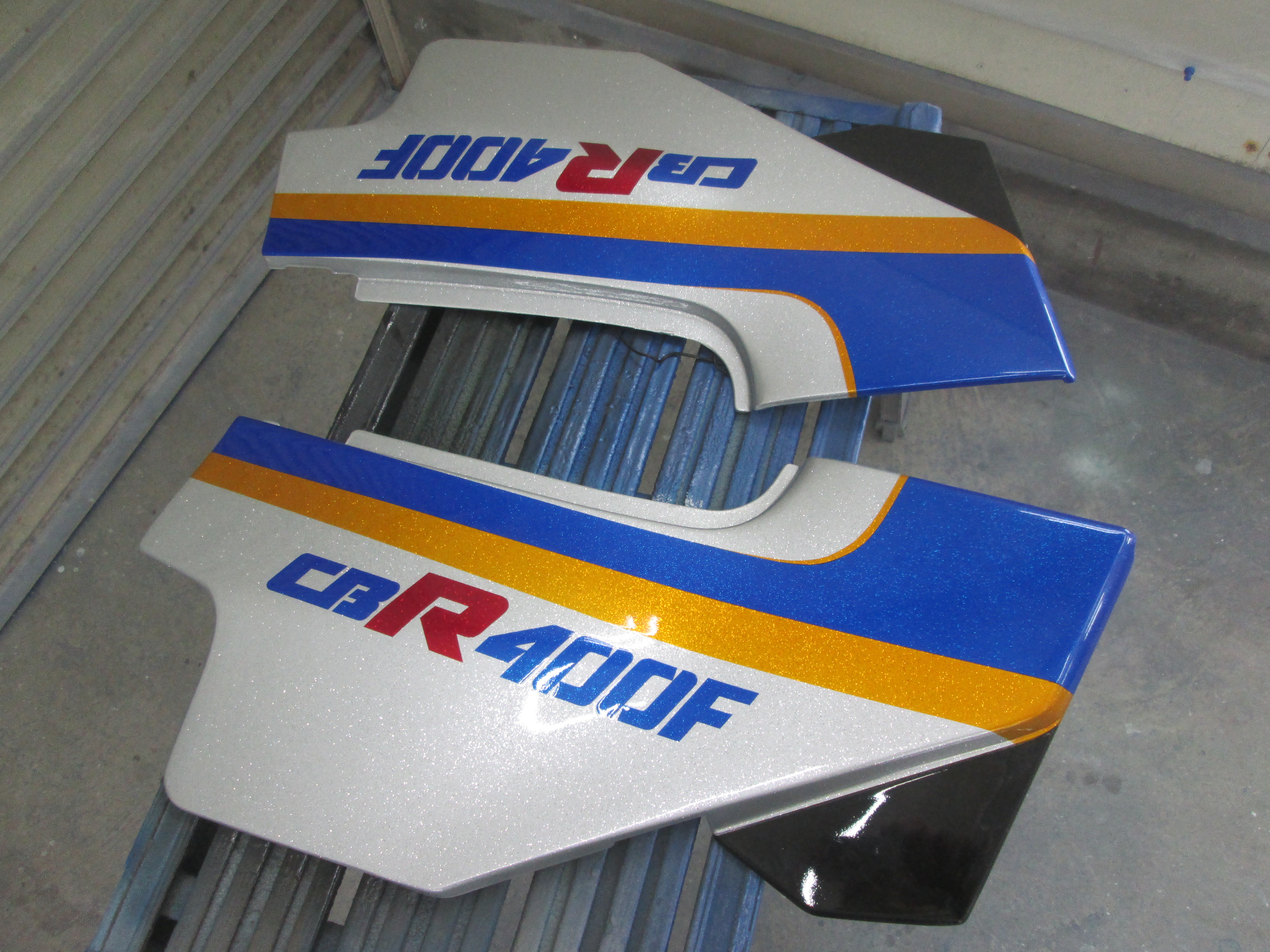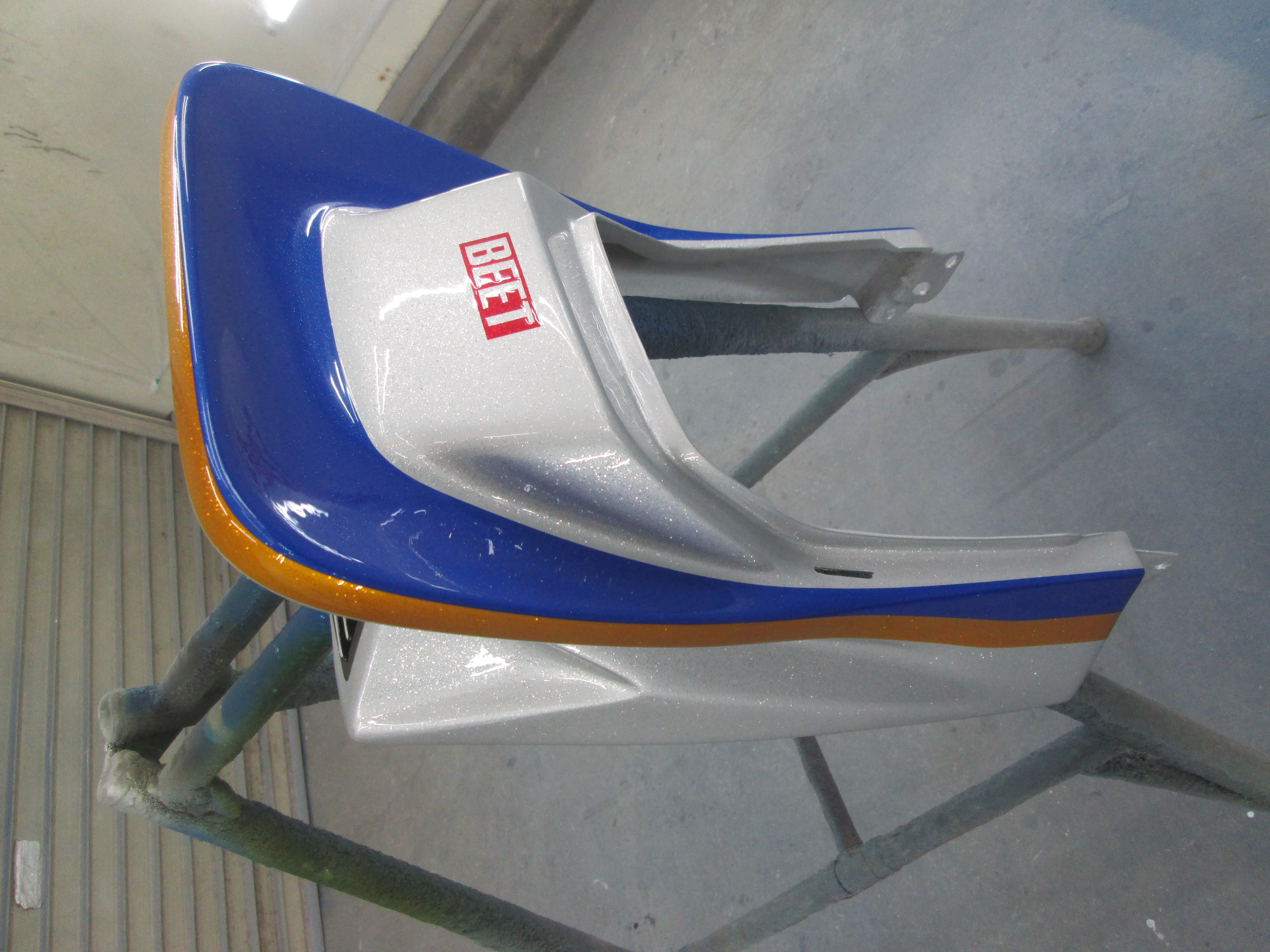 CB400F 追加部品の塗装です。 ビートのテールカウルです。取りあえずシルバーフレークの塗装、 次に、サイドカバーにラインの位置を合わせてキャンディイエロー、ブルーを塗装します。 ビートのロゴは、キャンディレッドです。 スリットの部分は、黒色・・・ 段取クリア、仕上げのクリアで・・・ 完成! テールカウルだけの塗装なのですが、かなり作業時間が・・・