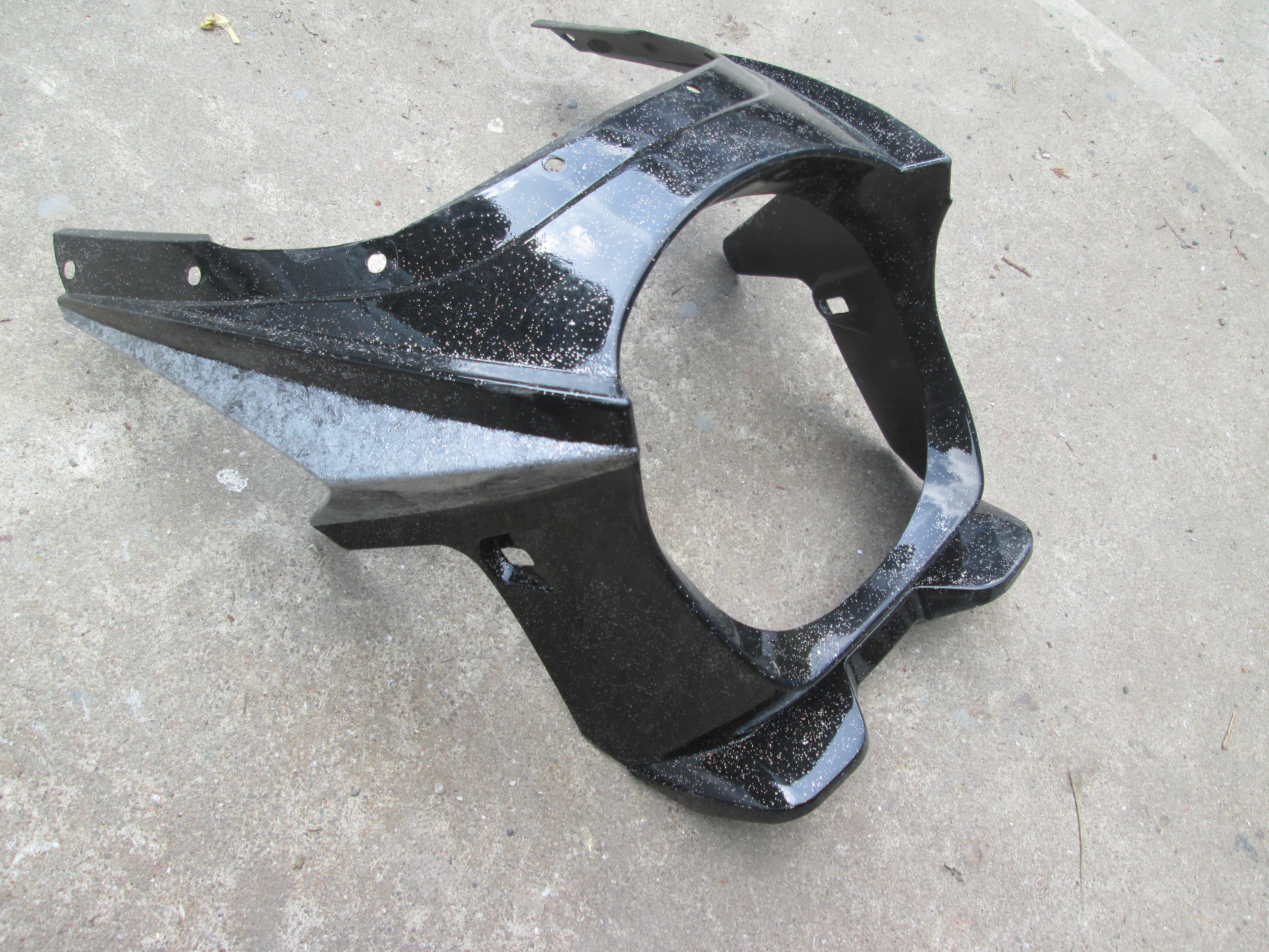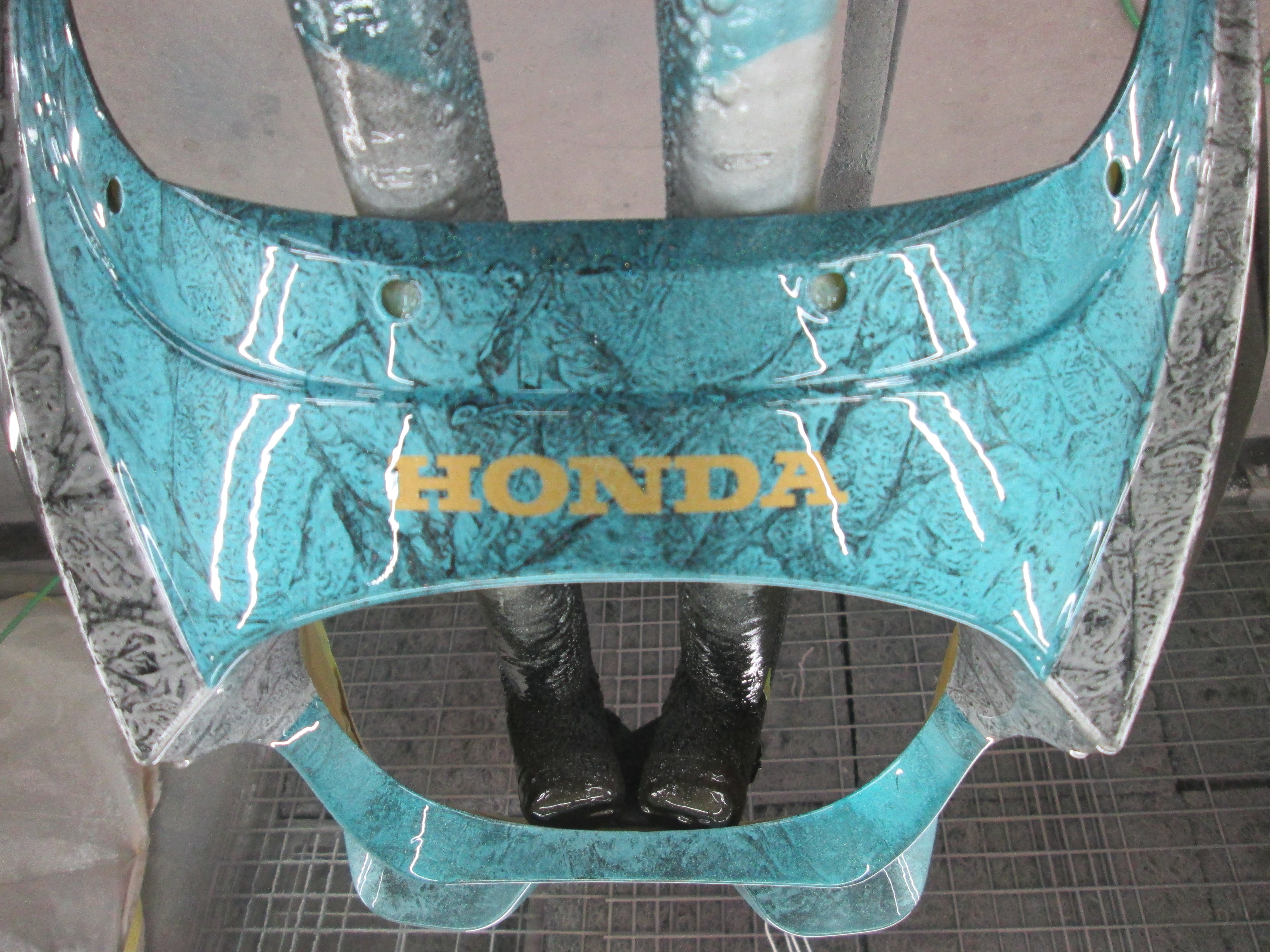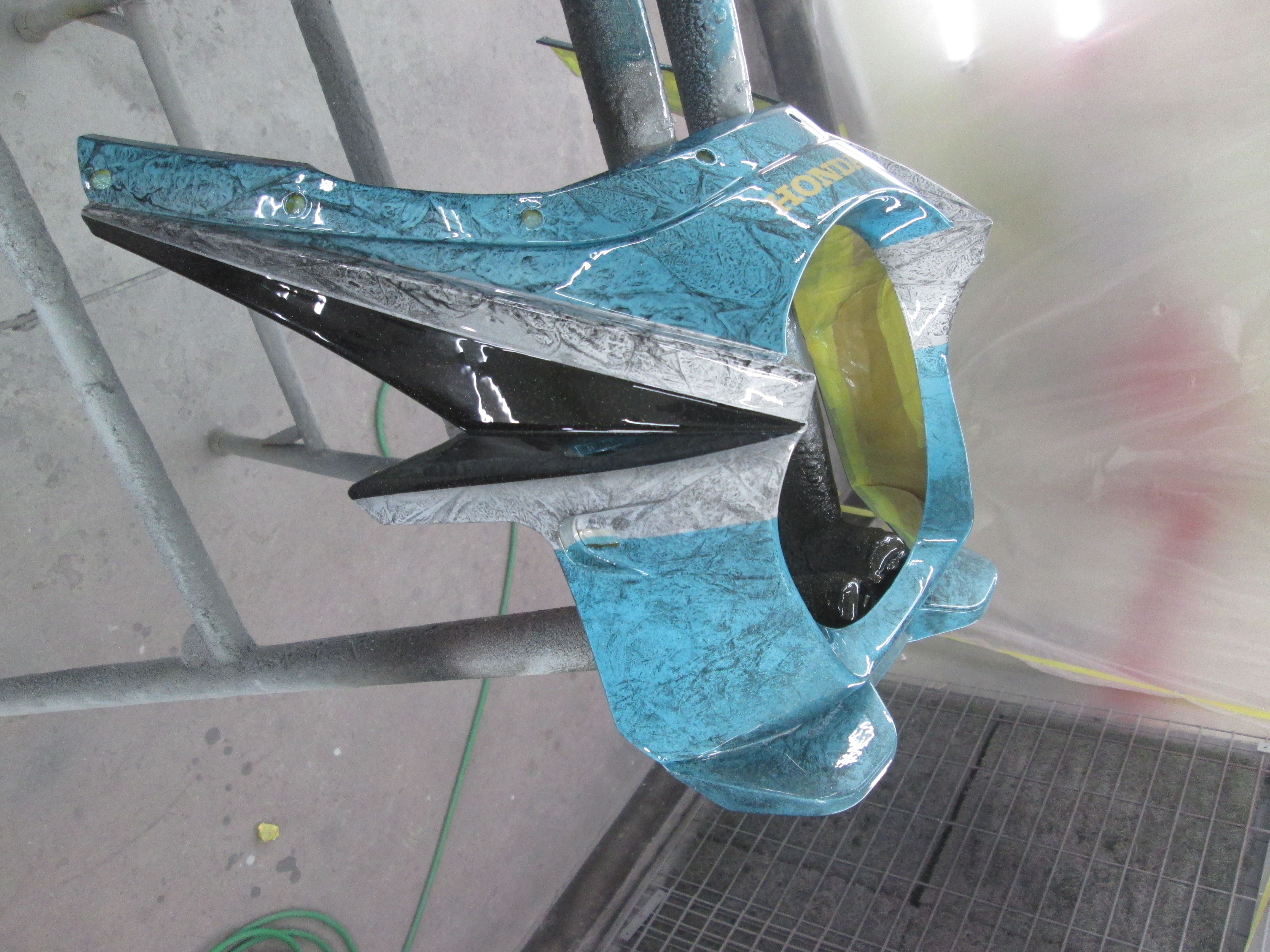 ホンダCB400 ビキニカウルの塗装です。 ボディの塗装に合わせてください・・・とのことなので、キャンディブルー?の調色から始めます。 塗り板にラップして、キャンディ塗って・・・こんな感じですね。 カウルに黒を塗りシルバーでラップ・・・ マスキングしてキャンディーブルーです。 ロゴも入れました。 完成。 オーナー様のイメージにピッタリで、とても喜んで頂きました。
