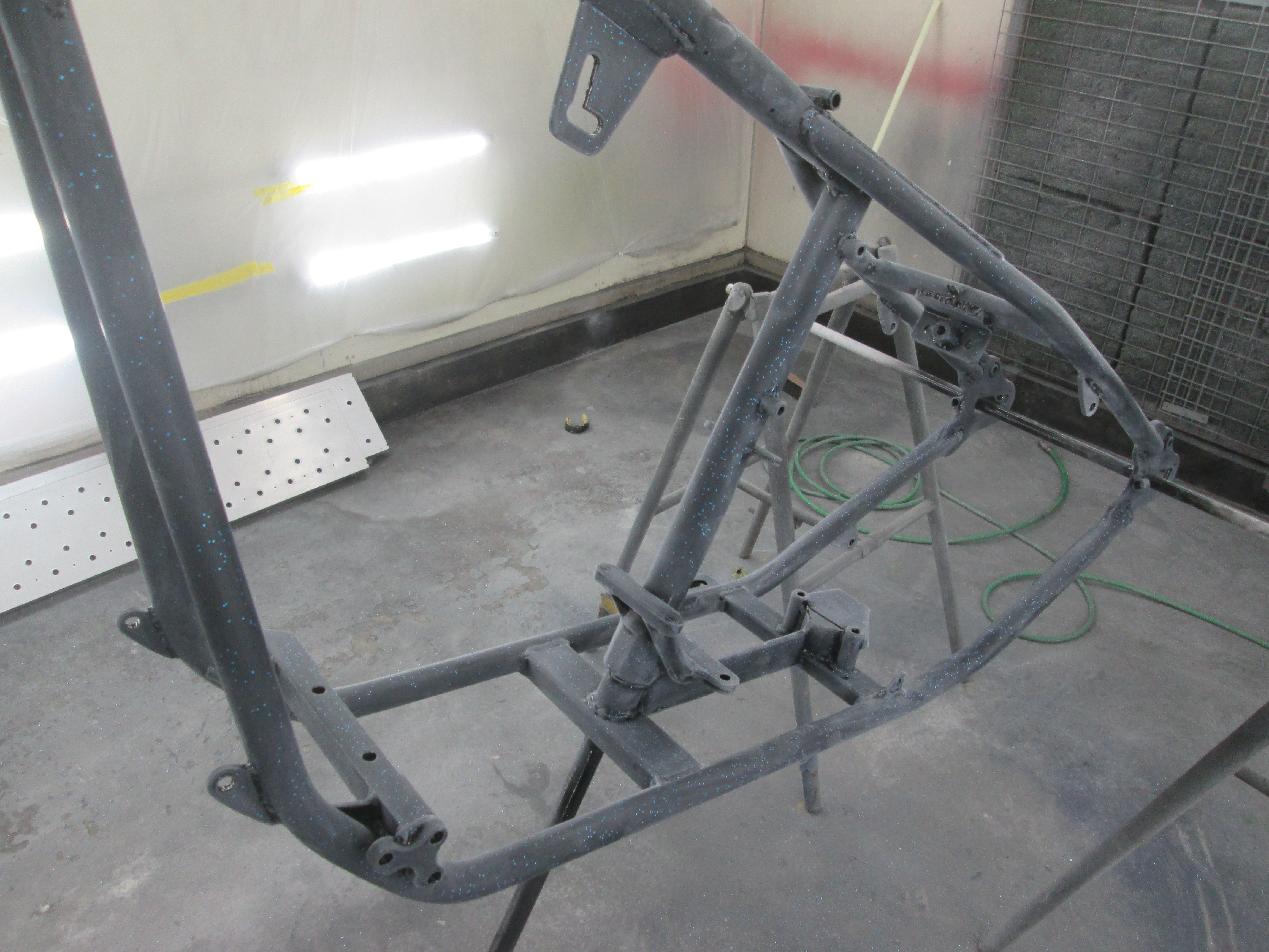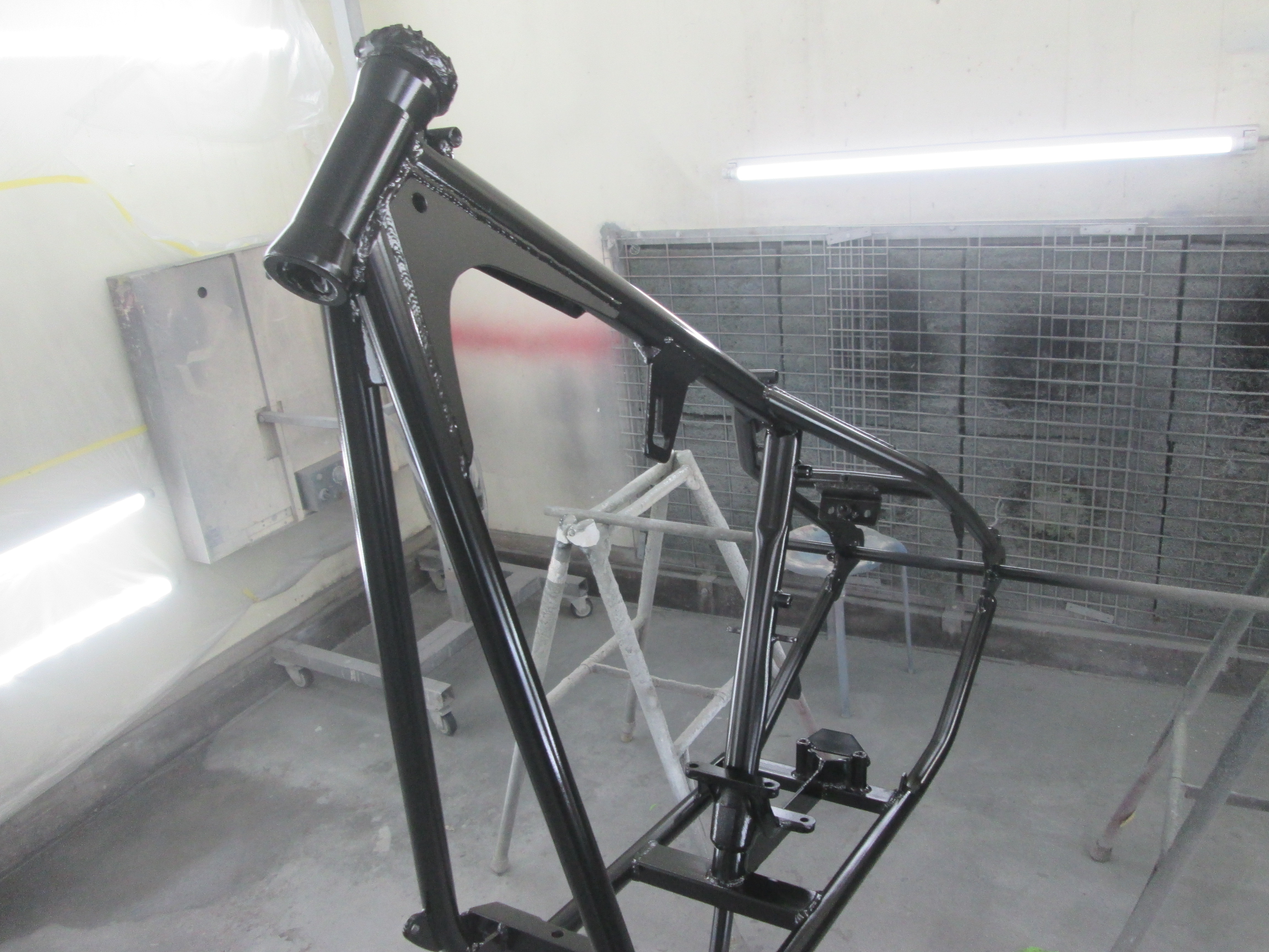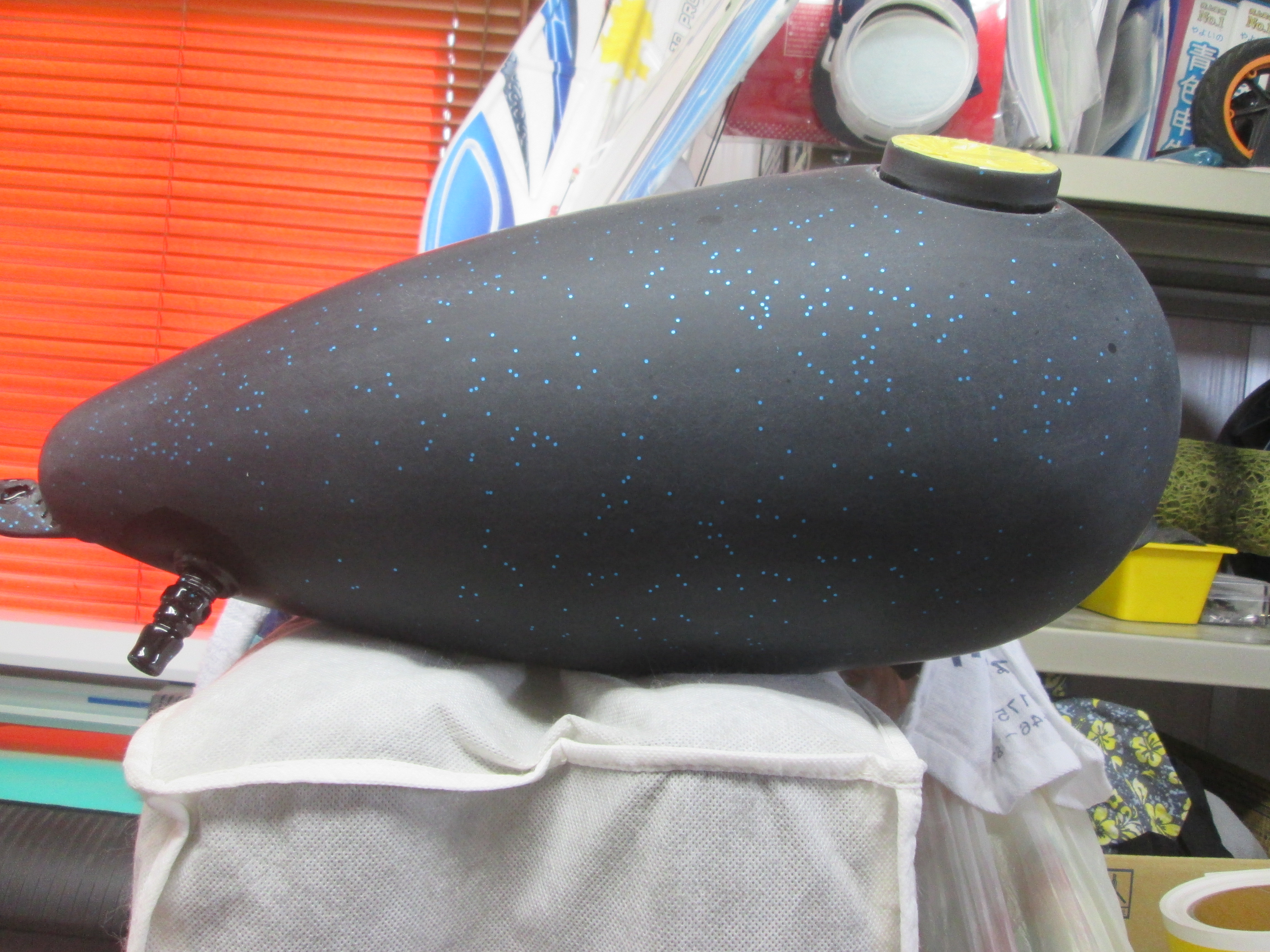 フレームの塗装です。ブラスト、プライマー、サフェイサーです。 色のサンプルです。黒色ベースで0.8mmぐらいのブルーフレークです。このまばらな感じが難しそうです。 黒色、 ドライでいきます。吹き付けすぎに注意です。 フレークをクリアで段取して、仕上げのクリアです。 タンクには、ファイヤーパターンを入れて作業終了です。・・・完成画像撮りわすれました。><