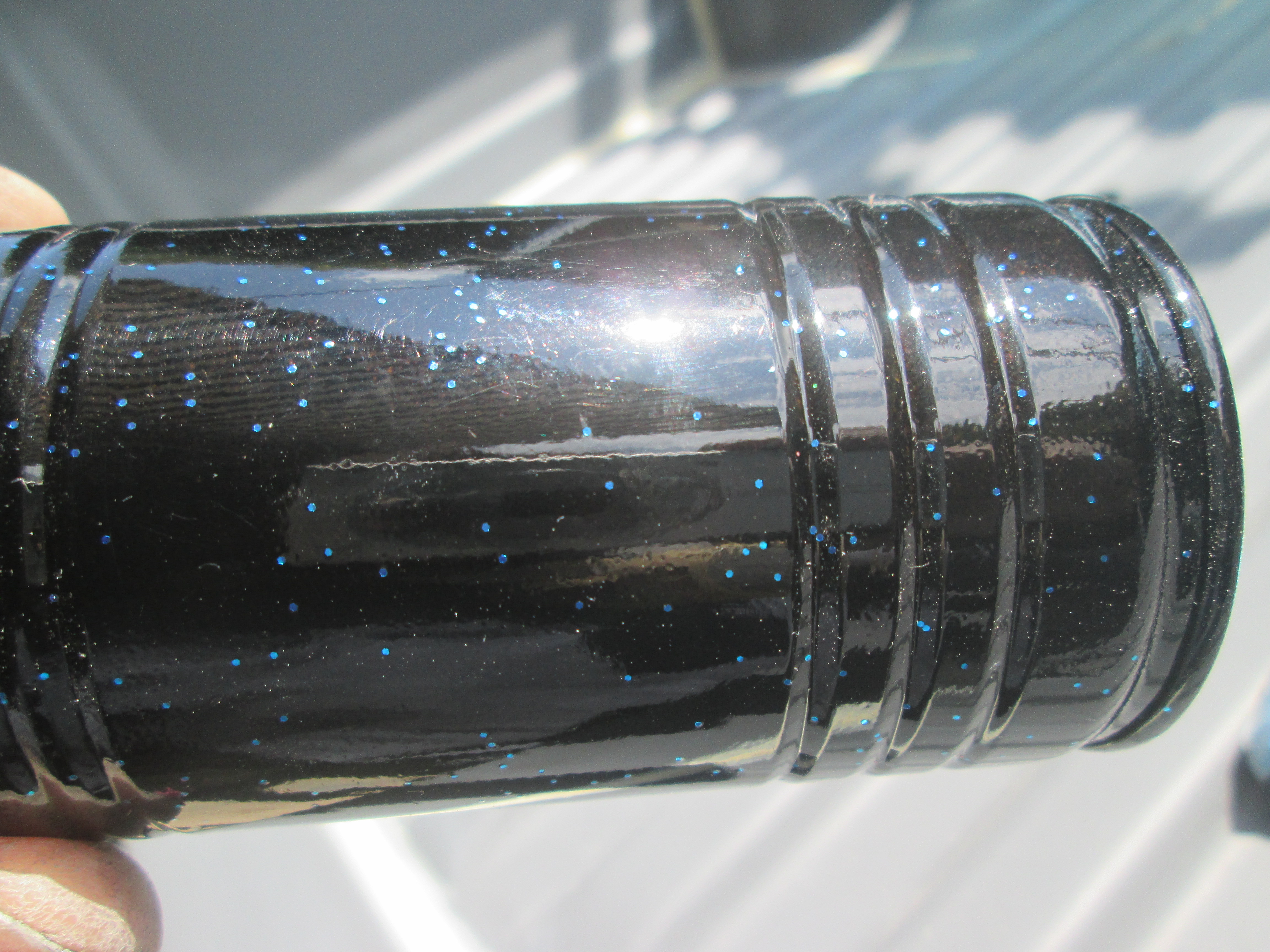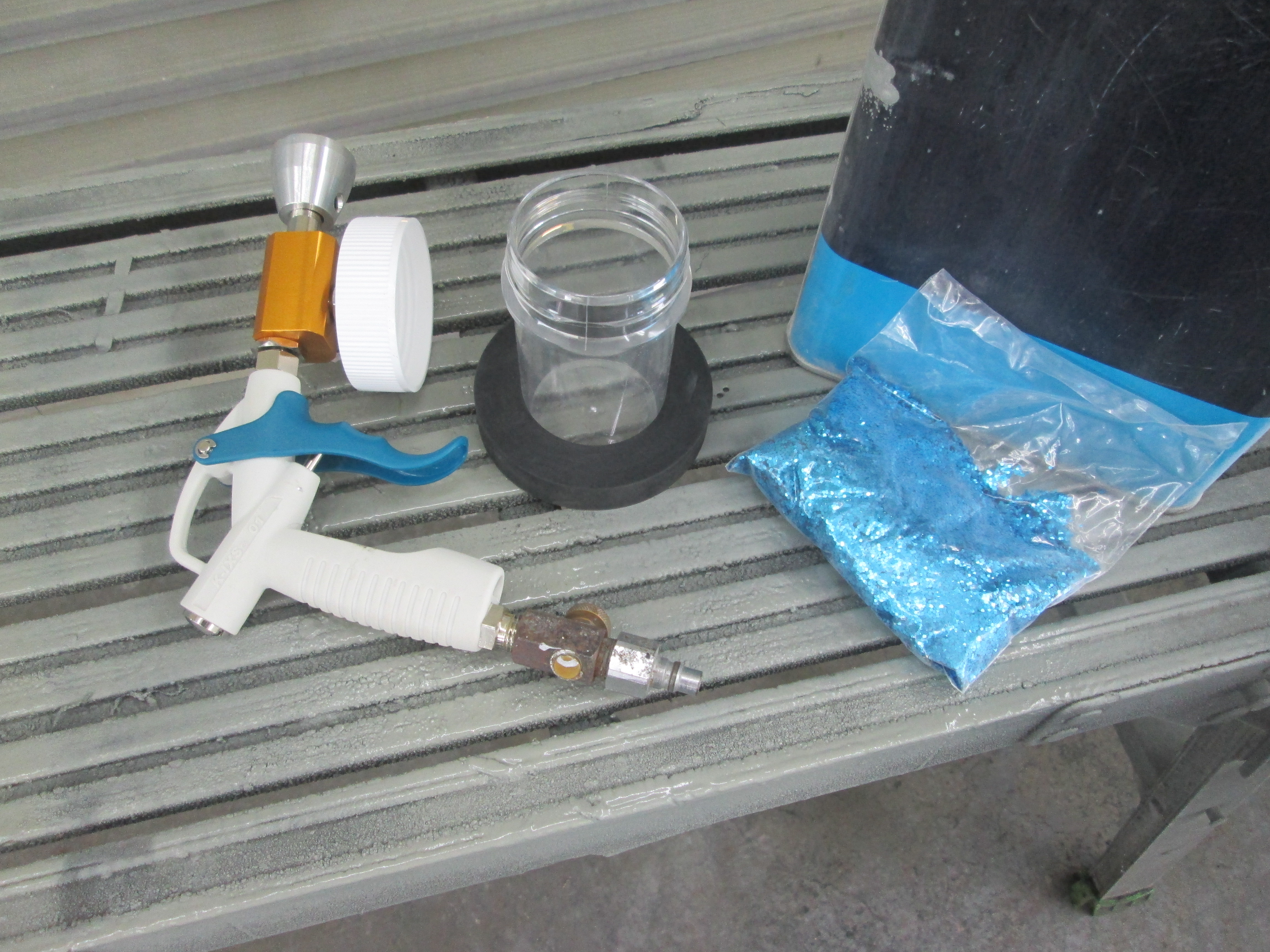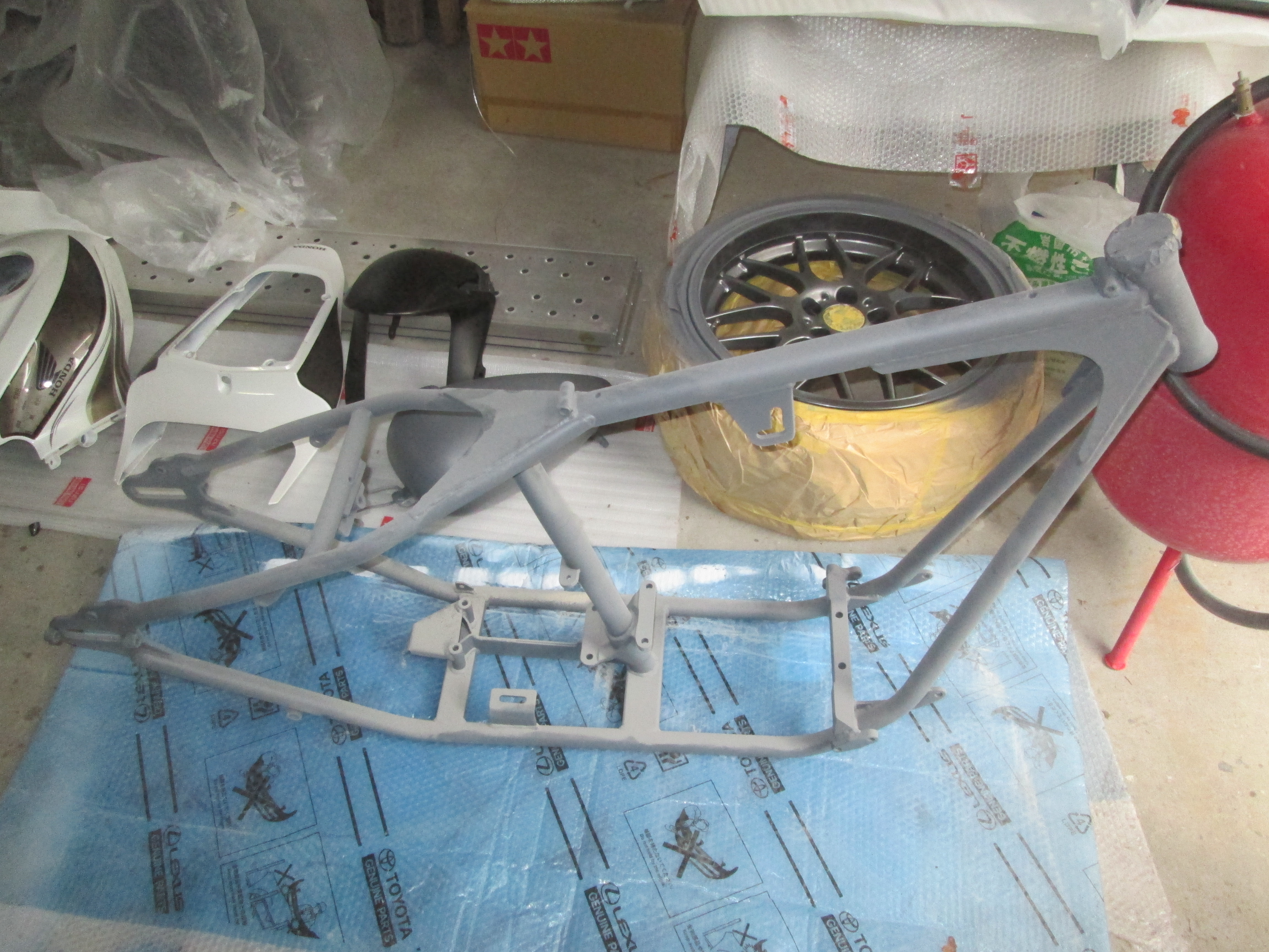 フレームの塗装です。ブラスト、プライマー、サフェイサーです。 色のサンプルです。黒色ベースで0.8mmぐらいのブルーフレークです。このまばらな感じが難しそうです。 黒色、 ドライでいきます。吹き付けすぎに注意です。 フレークをクリアで段取して、仕上げのクリアです。 タンクには、ファイヤーパターンを入れて作業終了です。・・・完成画像撮りわすれました。><